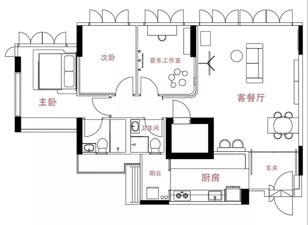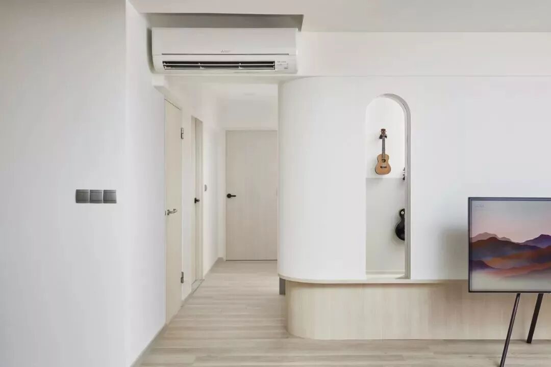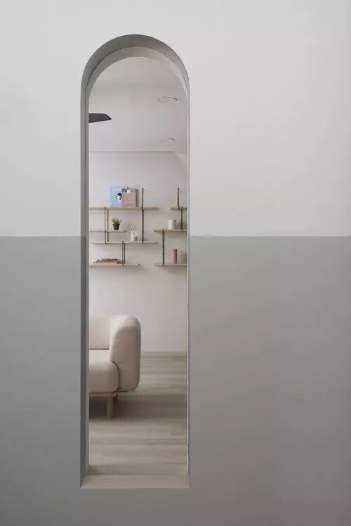 弧形墙和狭长拱形窗洞,连接音乐工作室和客厅区域。身处两个空间的人,可以通过这里进行有趣的互动,缓解大白墙的单调~