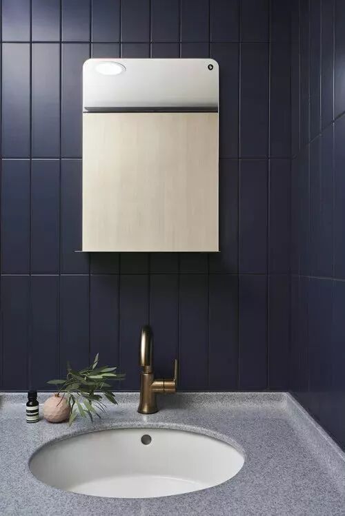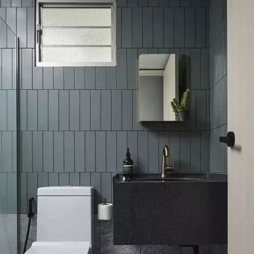 两个卫生间风格一致,海军蓝/灰绿色瓷砖和黄铜水龙头,营造出精致的高级感。