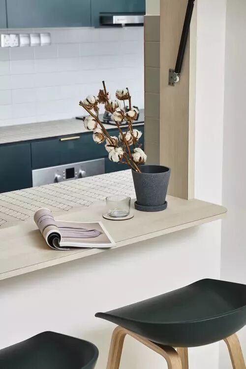 厨房和客餐厅之间,设置了一个小型吧台,增加空间连结感。