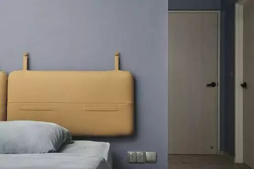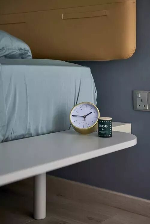 用一块搁板取代传统的床头柜,简洁利落,手机、眼镜、闹钟等等小物也有地方收纳。