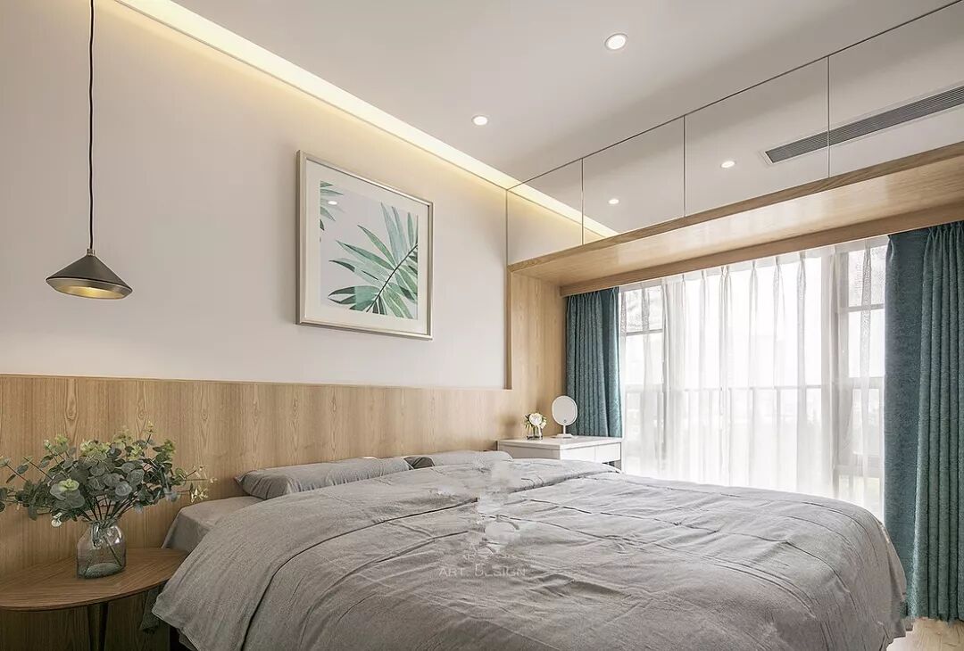 ▲木质卧室背景适合用在北欧、日式、简约等风格里。用木饰面板代替那些老套的相框,再加一个装饰画进行装扮。