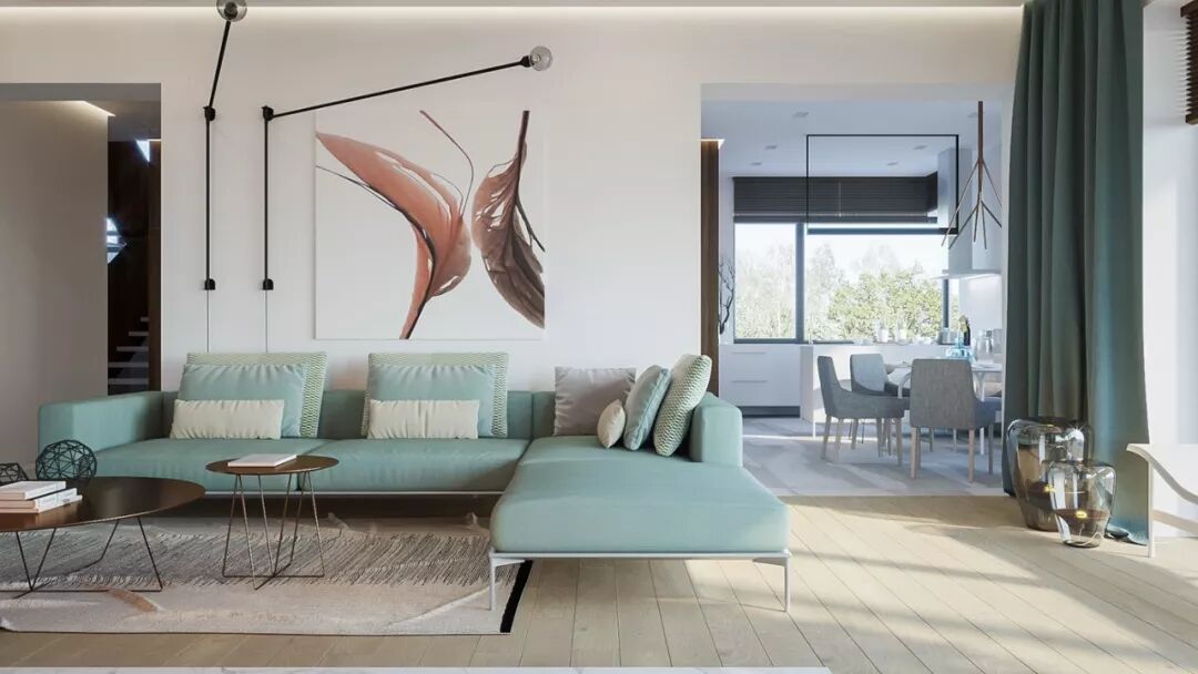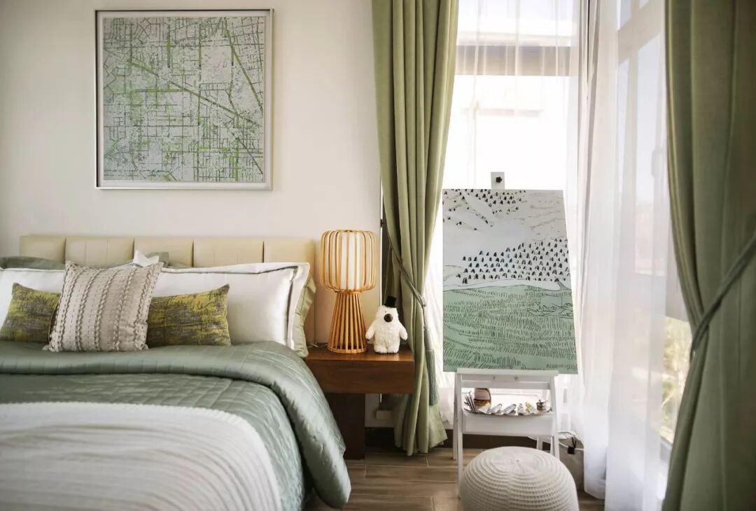 如果墙面颜色不太喜欢,也可以根据空间主体家具、饰品的颜色选取,比如沙发、挂画、抱枕、餐桌、床品等,但色调的深浅一定要有所区分。