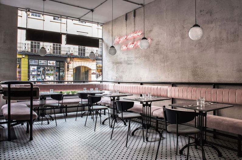 ▲主餐厅分为粉、白两块区域,粉区采用了复古的马赛克砖铺贴地面,墙面也是硬朗的混凝土材质,营造出轻工业与粉色调的有趣碰撞。