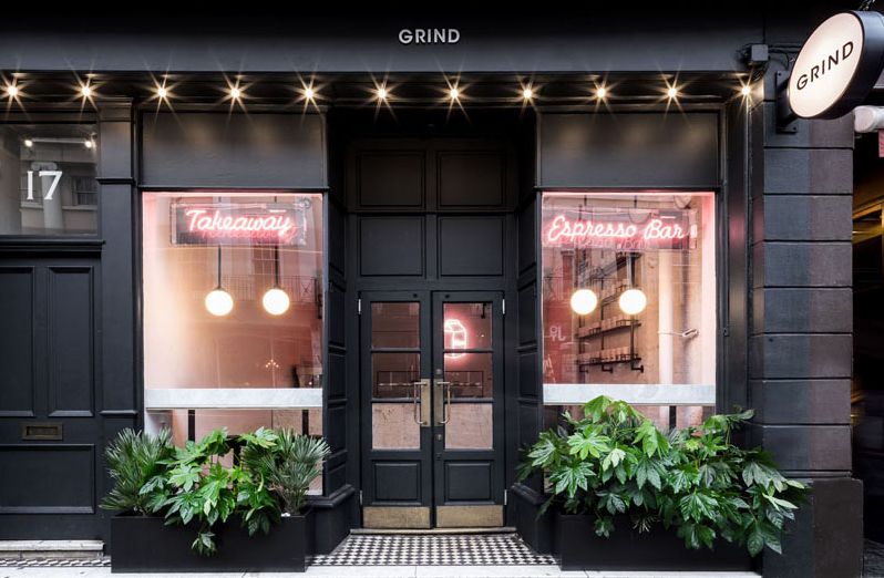 ▲Greenwich Grind 位于建筑的一层,以黑色作为外墙的主要色彩,与老建筑形成鲜明的对比。