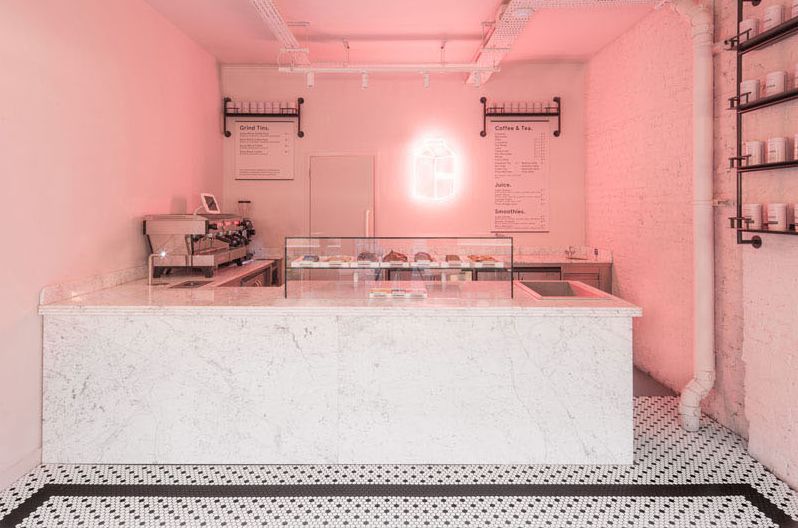 ▲外卖区以粉色作为主色调,清新甜腻的氛围与建筑原先裸露的管道、粗犷的石材形成了鲜明的对比。