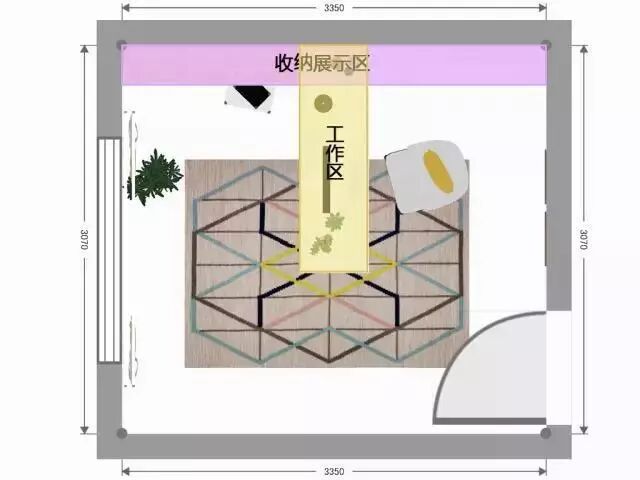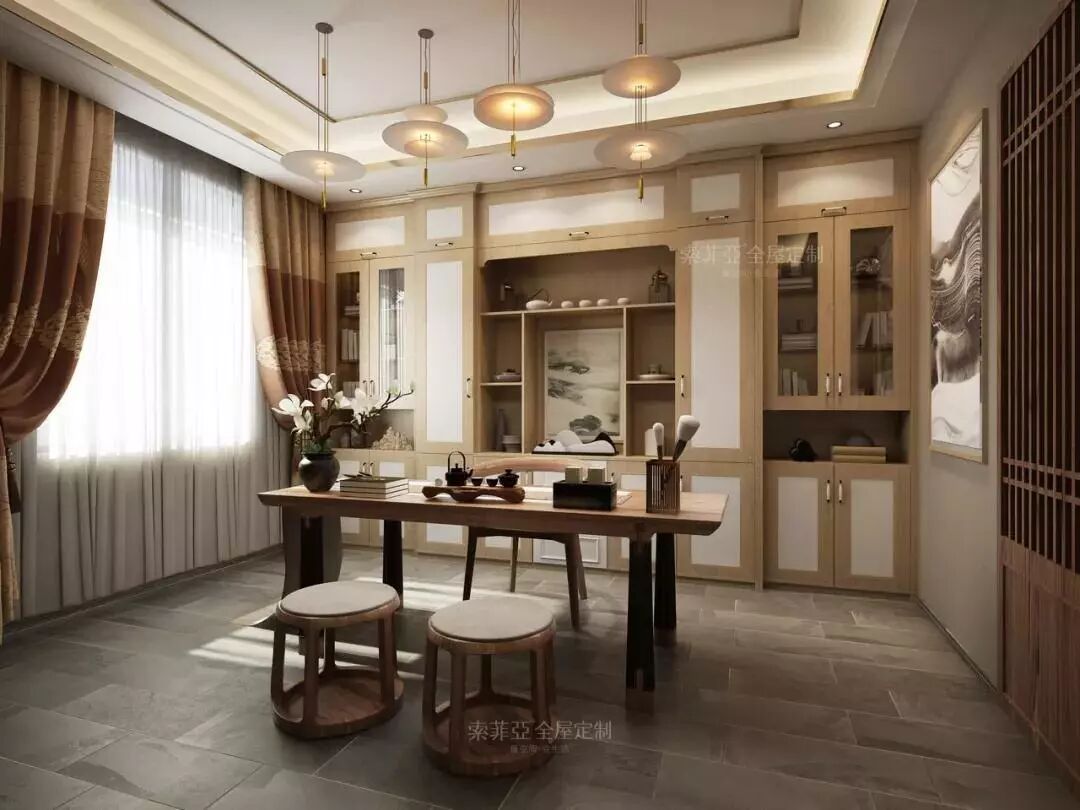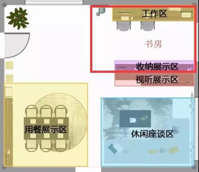 利用右面的综合电视陈列柜在客厅隔断出宽度2m左右的空间作为半开放式书房。
