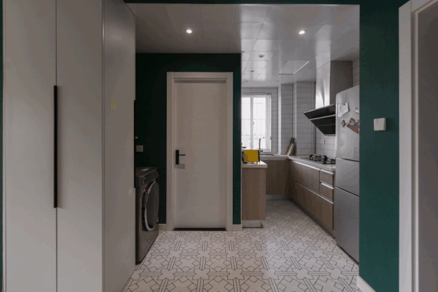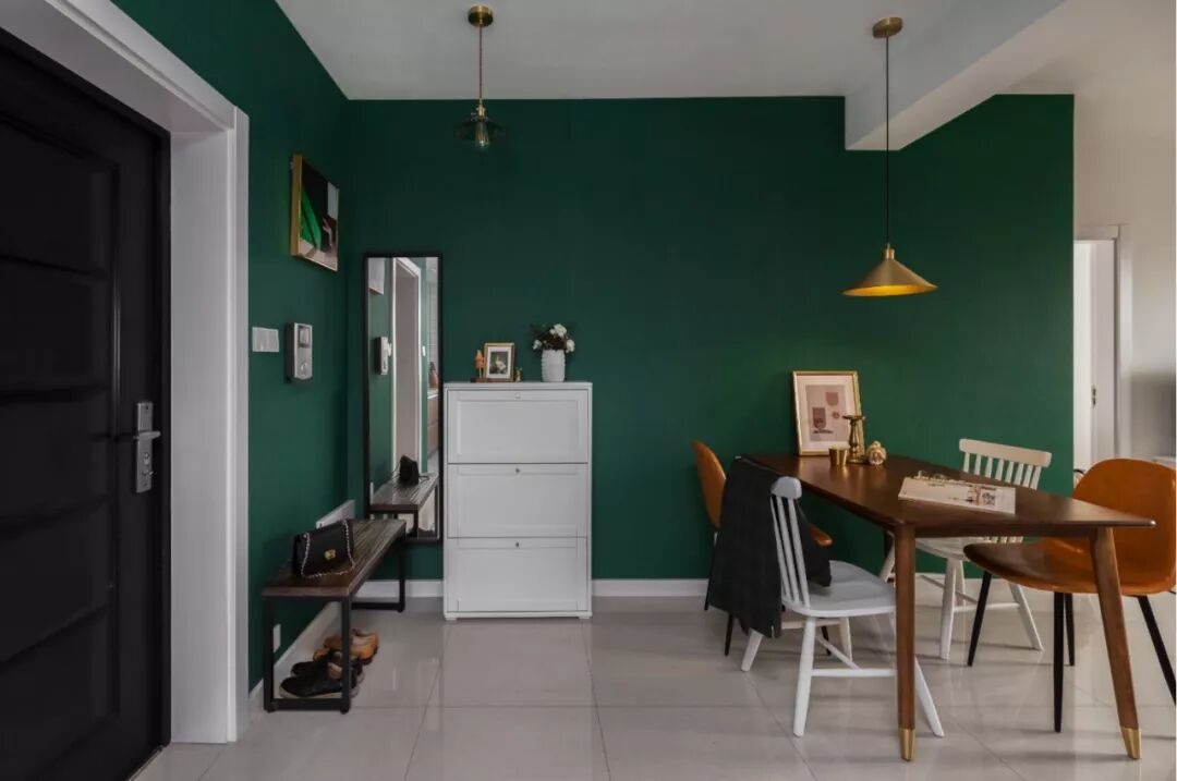 原先餐厅部分吊顶和灯带拆除。换成小吊灯和明装射灯的形式。从玄关到客厅都采用了杜松子绿墙纸使在视觉上有很好的延伸感与整体感。