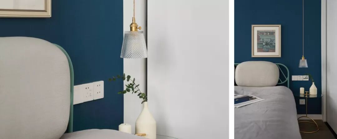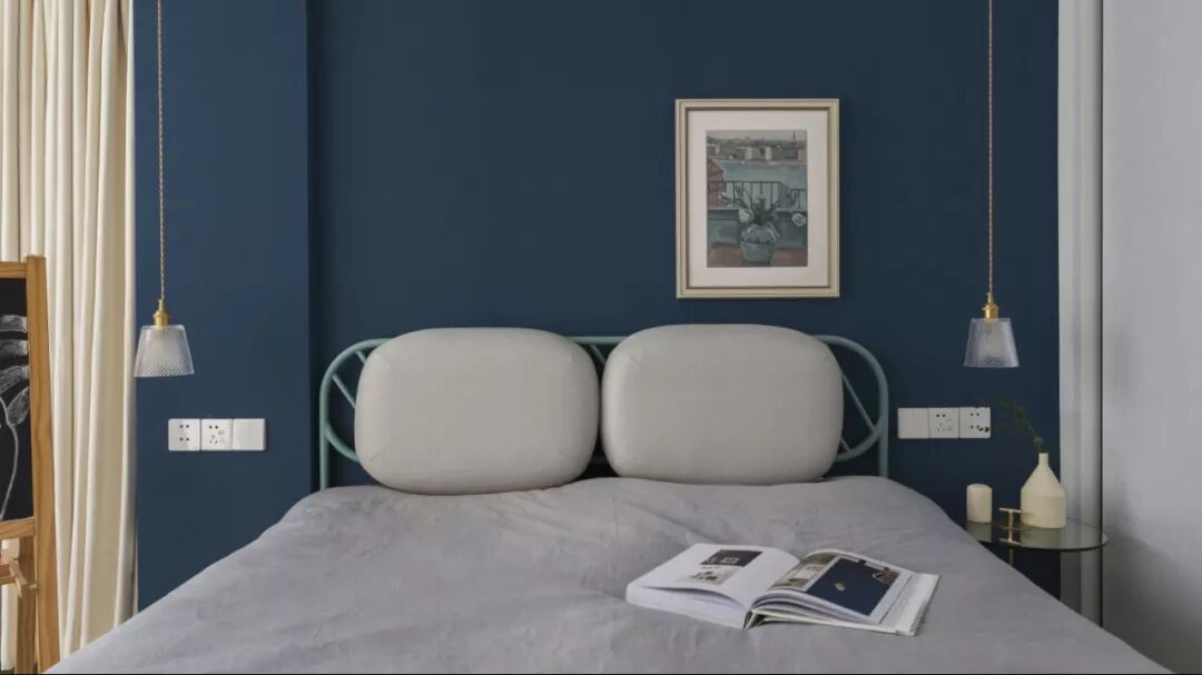 在三面留白的衬托下,海军蓝的床头背景墙,整个空间凸显了一种独特的宁静感。