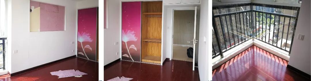 房间里面是红色的木地板,衣柜移门的样式有点过时。次卧室的部分做的是榻榻米,可角落里有发霉的状况出现。