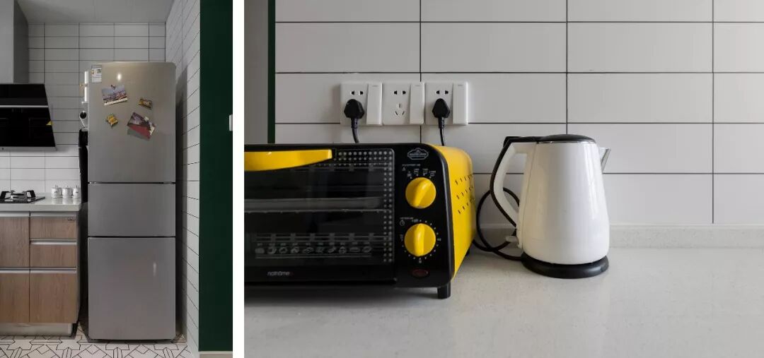 利用洗衣机边上的位置,做了两个方向的收纳柜。朝向餐厅的部分柜体预留了插座,为了之后可能会购买的吸尘器和其他电器设备做准备。朝向厨房的区域预留的柜子是考虑放置洗衣机等一些清洁物品的存放。