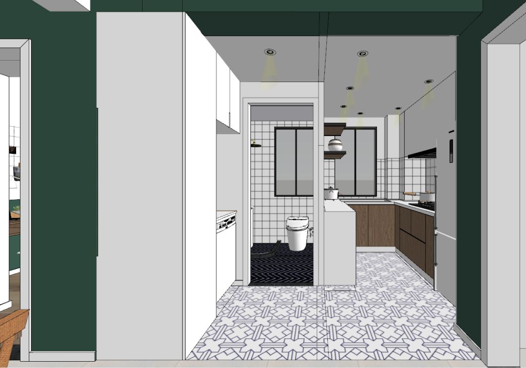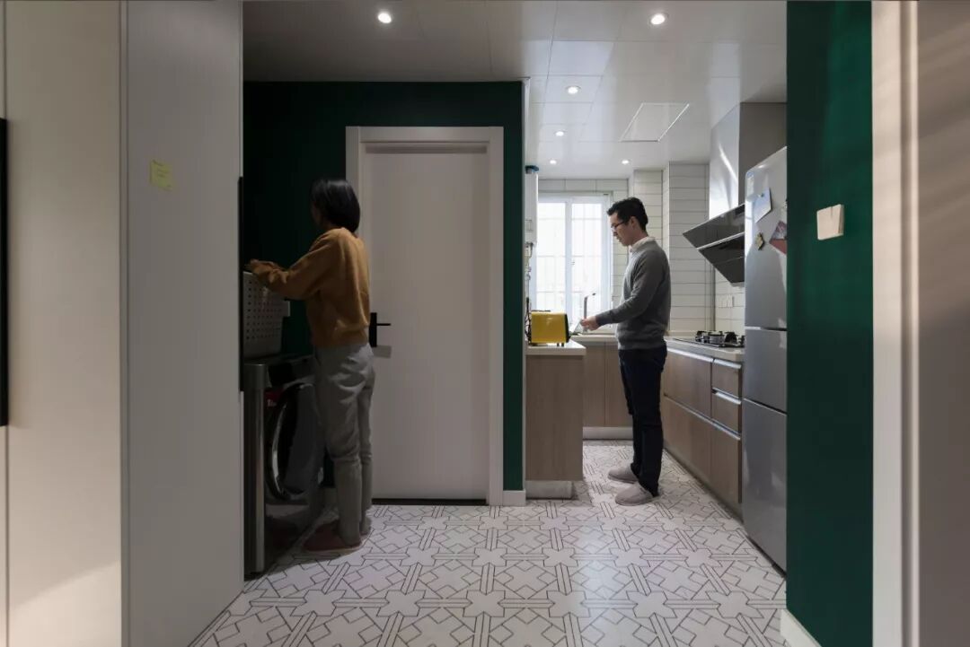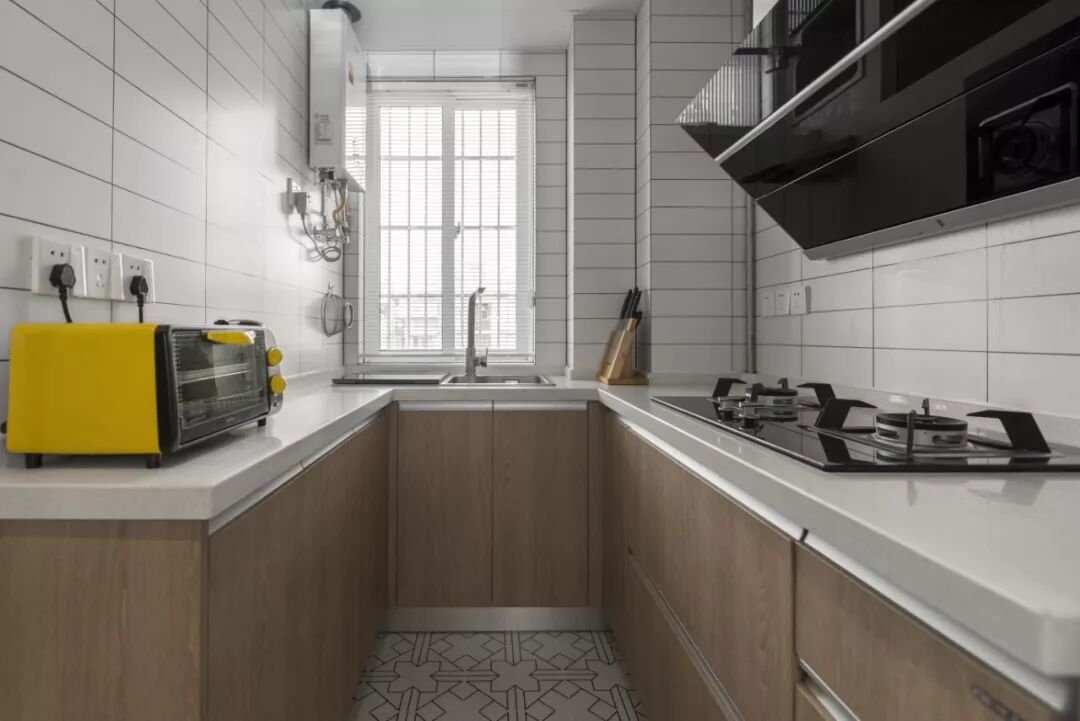 厨房和卫生间原先的墙体拆除砌成薄墙,将现在进入卫生间的门洞封住,把厨房和卫生间的区域分离开来,厨房变身U型厨房。这样除了正常布局外,增加了一排窄的柜子放置小家电。