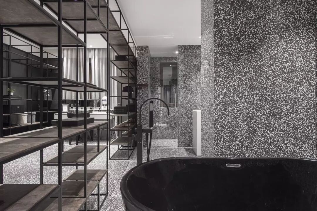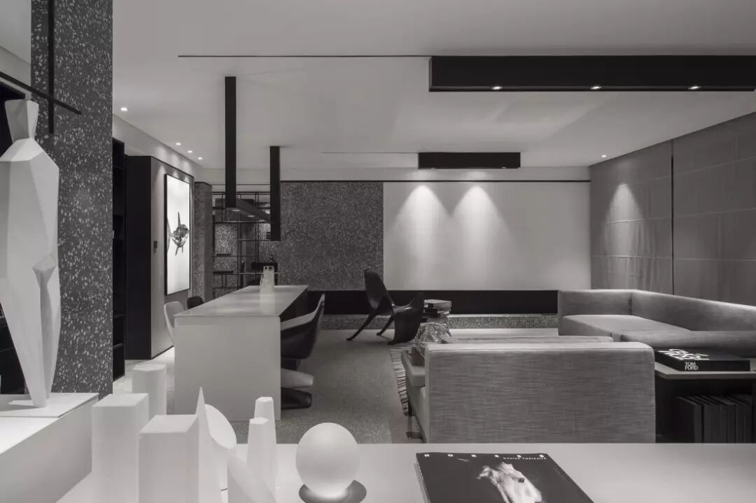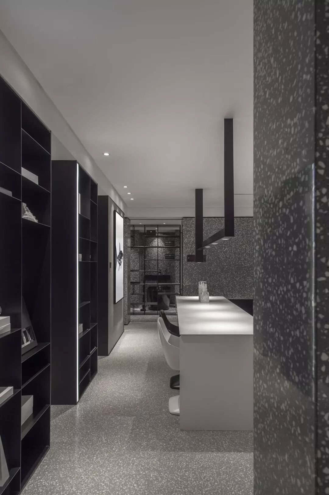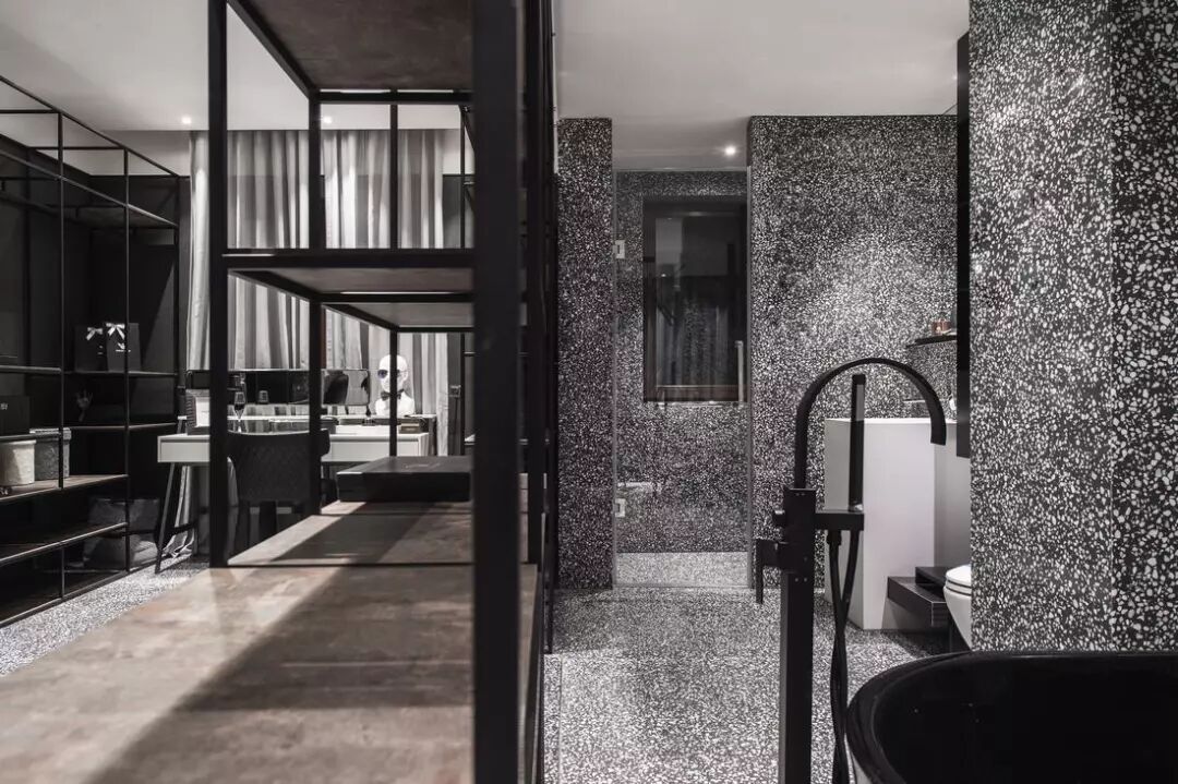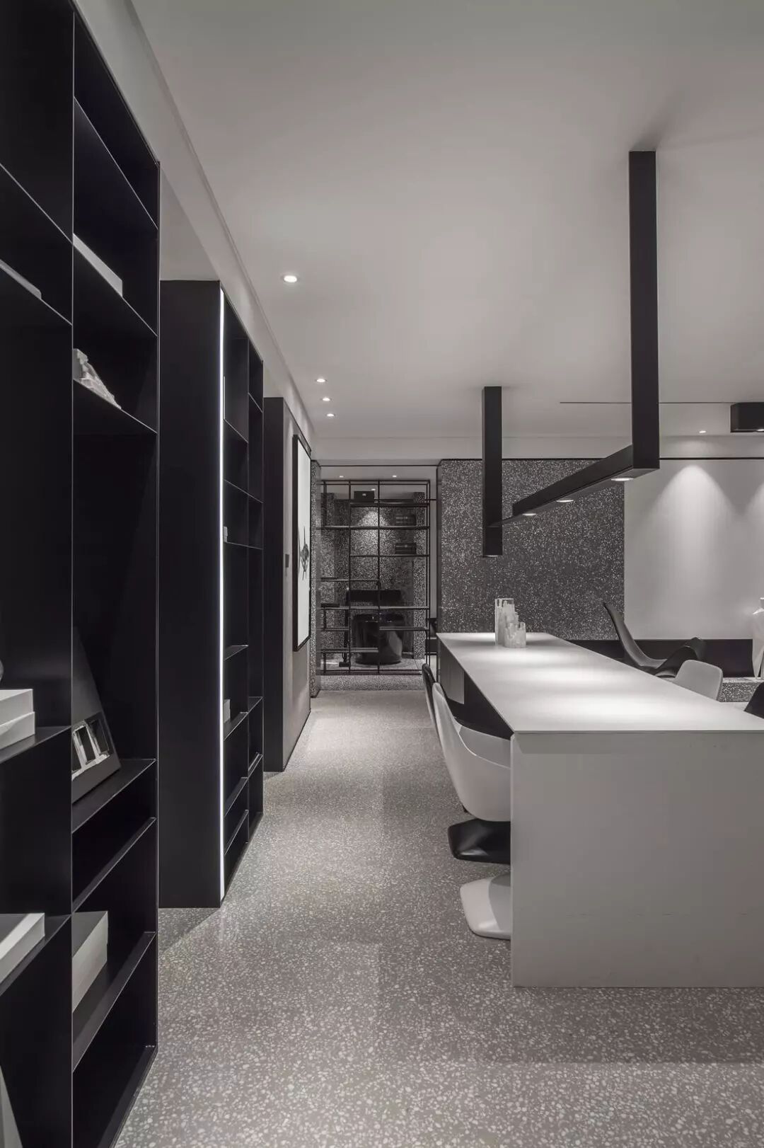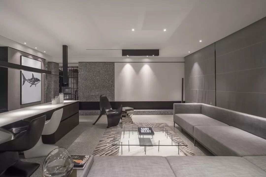 大块面大比例的简约设计,符合自己的习惯。根据生活的核心,在“空盒子”里围绕着工作、放松、娱乐、聚友逐层加入“我”的元素,全开放式格局,黑、白、灰三色主调,水泥、水磨石、金属架等充满阳刚气的材质横行。看起来最不像一个设计师的家,却也最符合一个设计师对家的“放肆”。