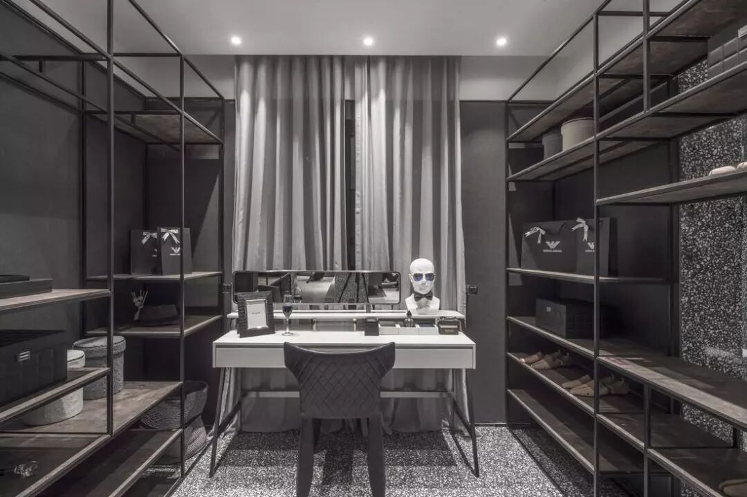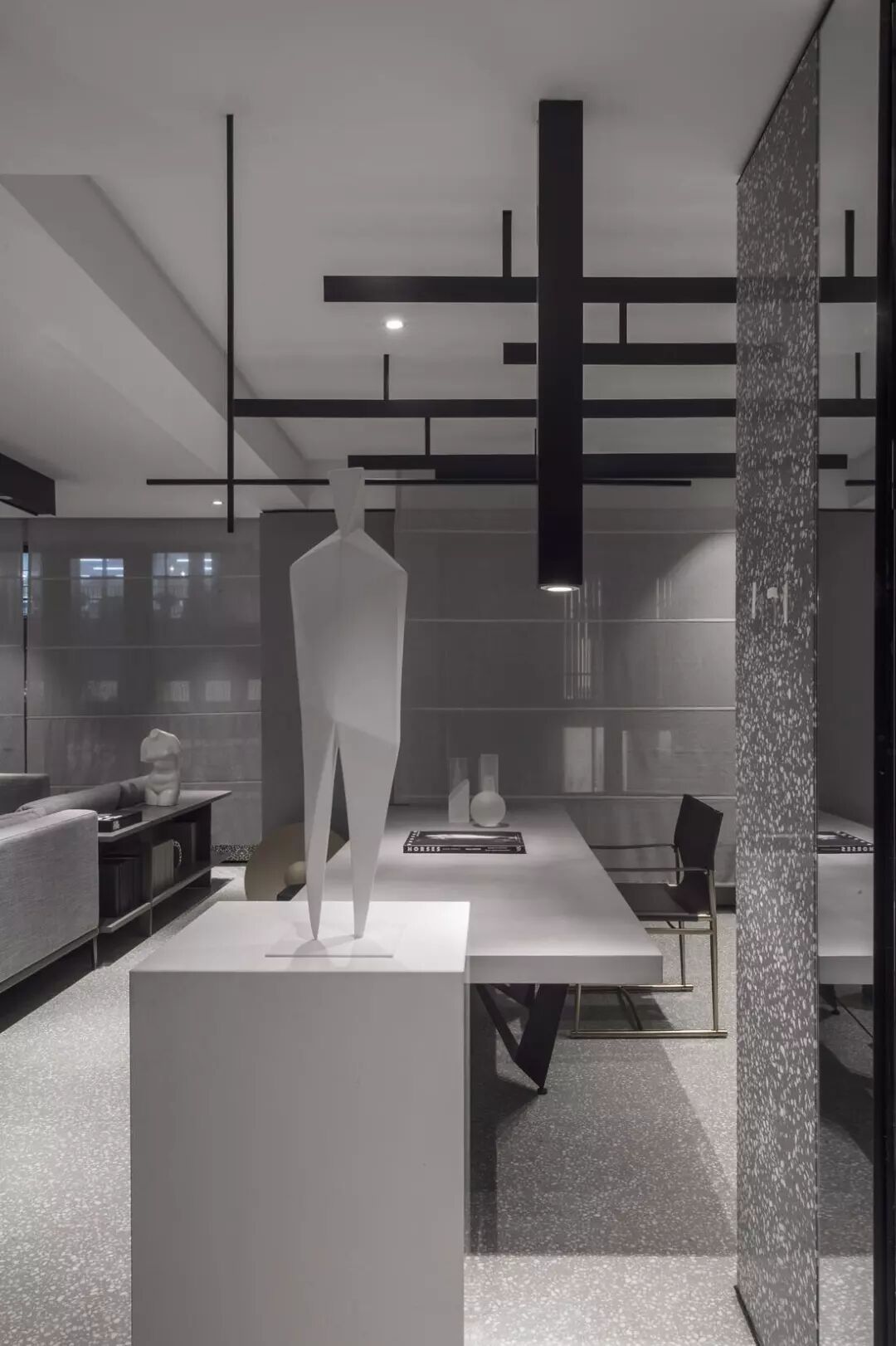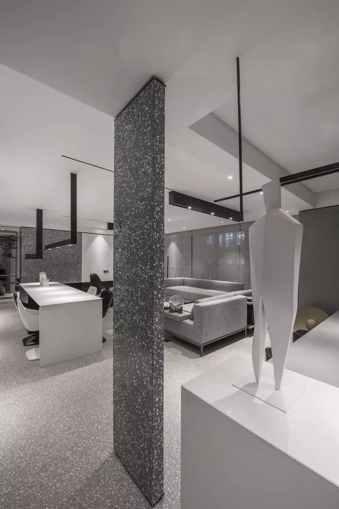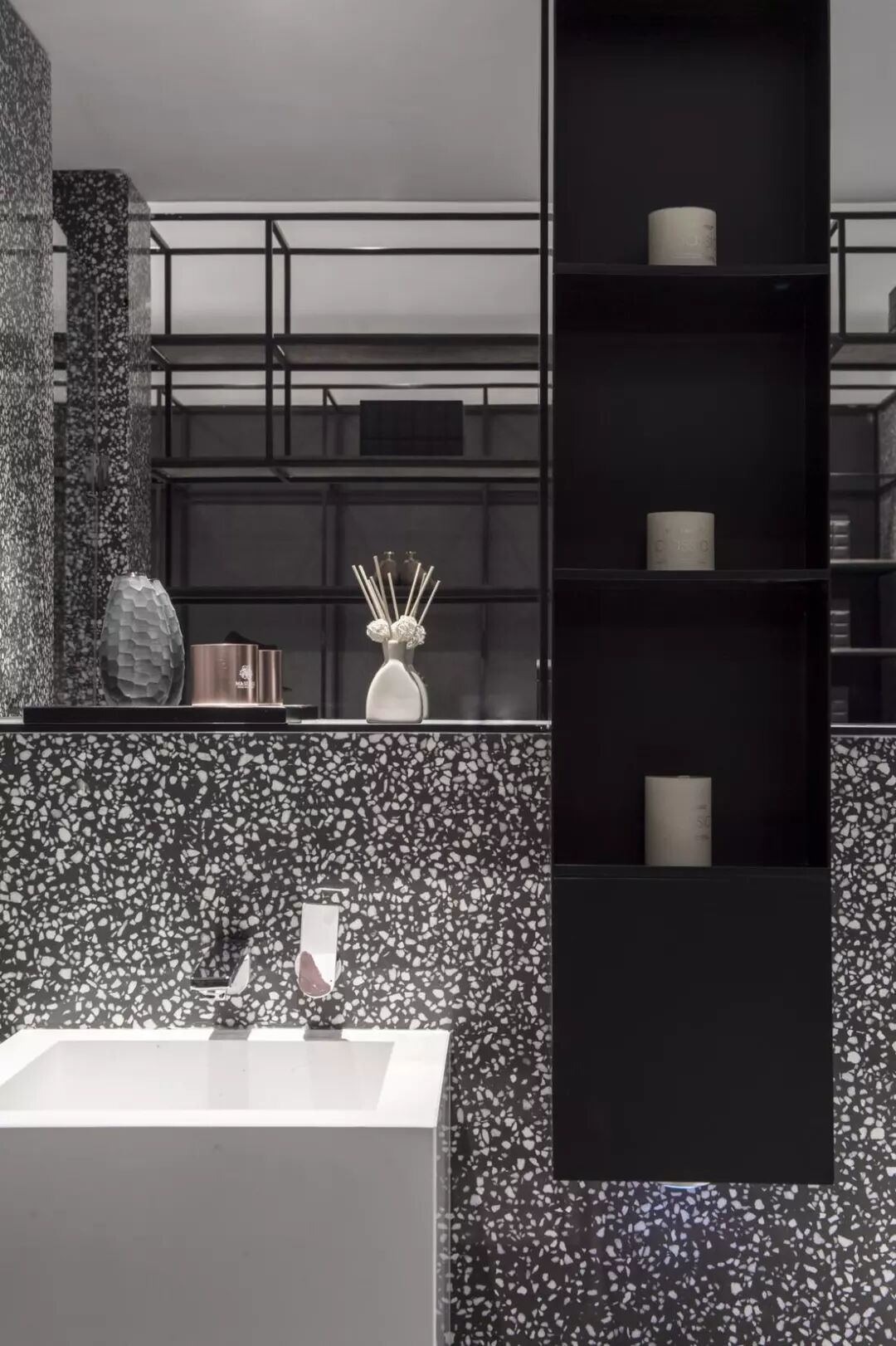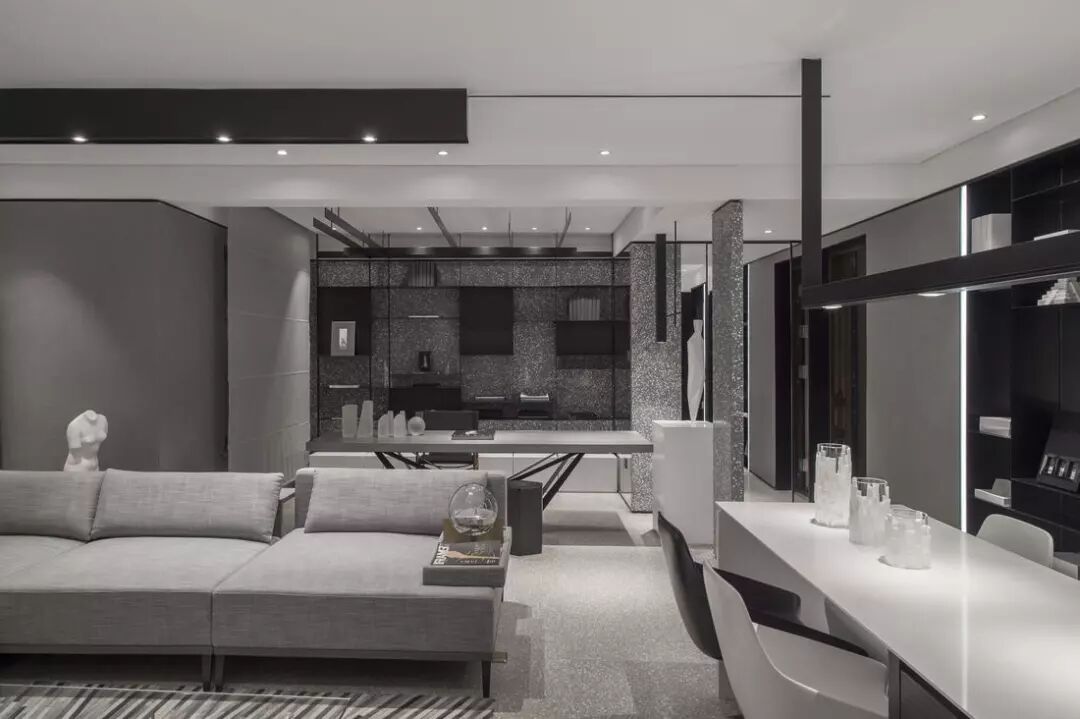 大块面大比例的简约设计,符合自己的习惯。根据生活的核心,在“空盒子”里围绕着工作、放松、娱乐、聚友逐层加入“我”的元素,全开放式格局,黑、白、灰三色主调,水泥、水磨石、金属架等充满阳刚气的材质横行。看起来最不像一个设计师的家,却也最符合一个设计师对家的“放肆”。