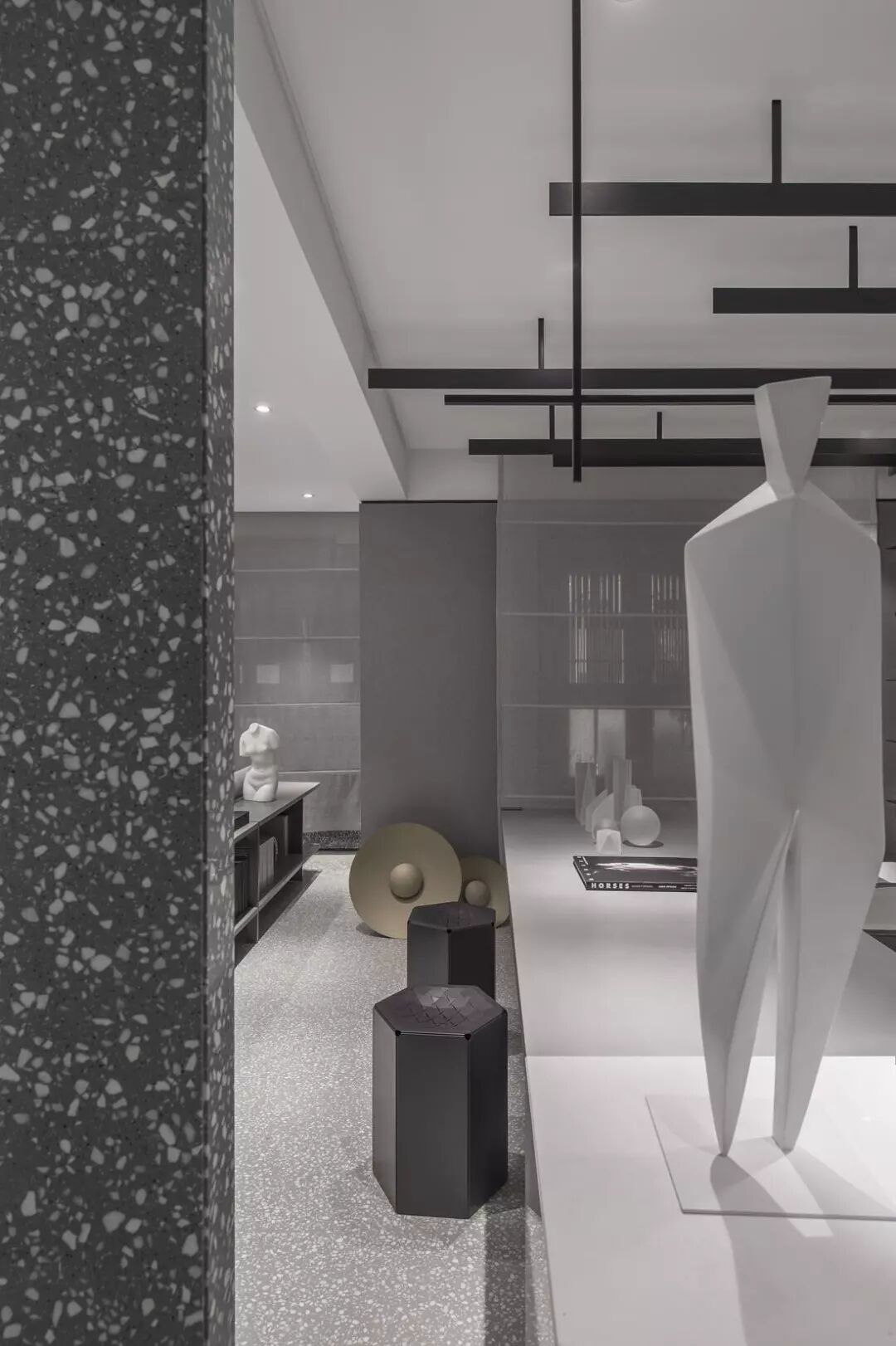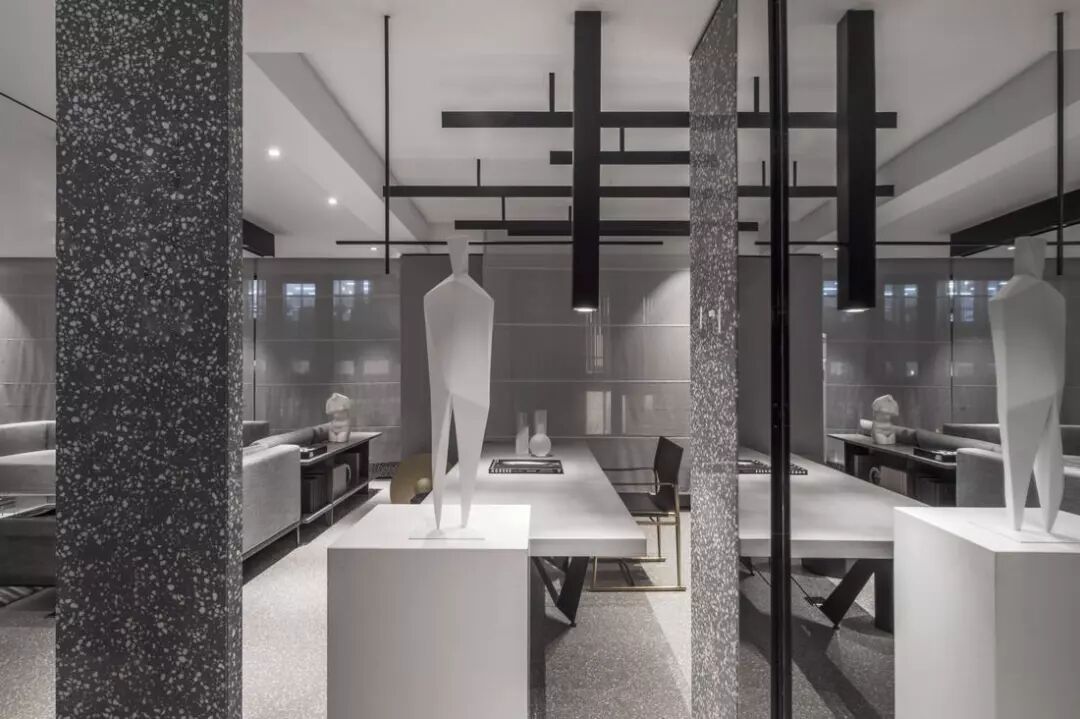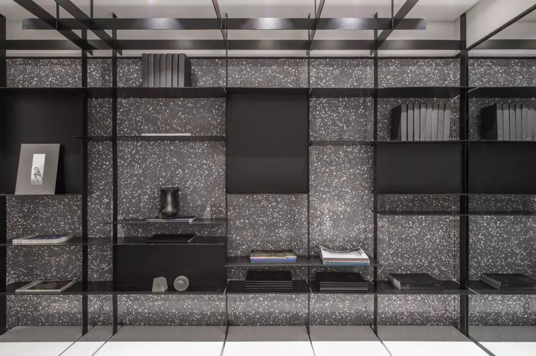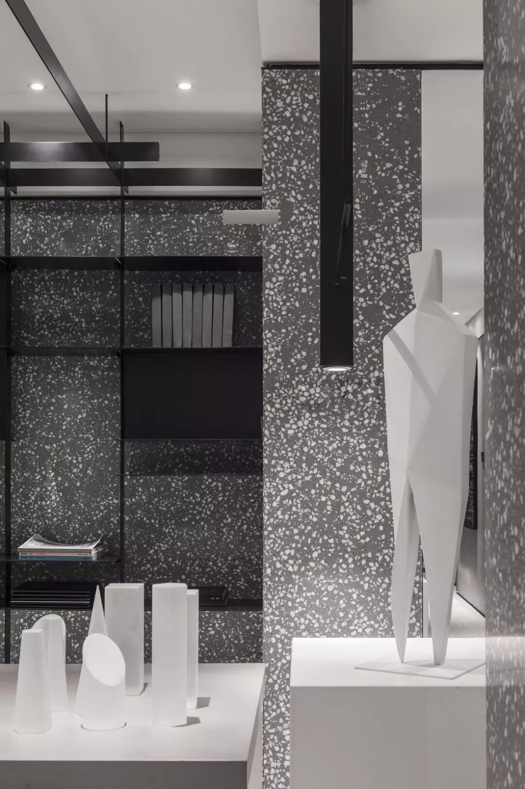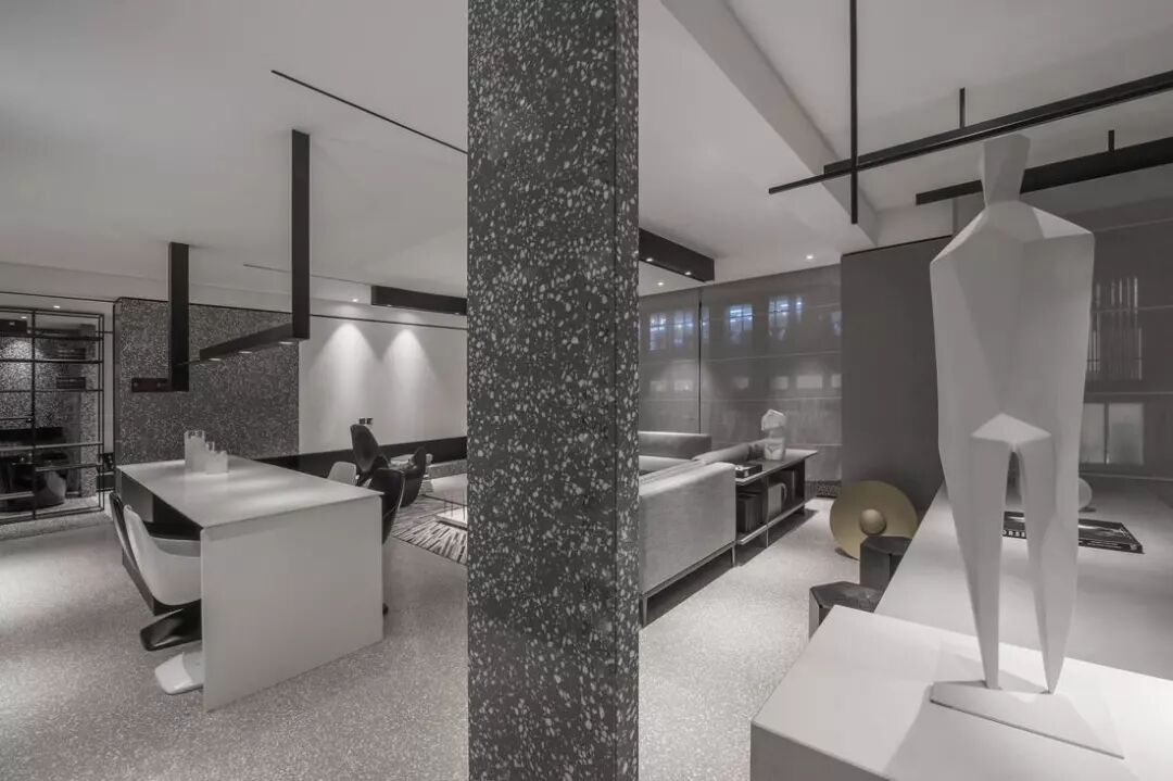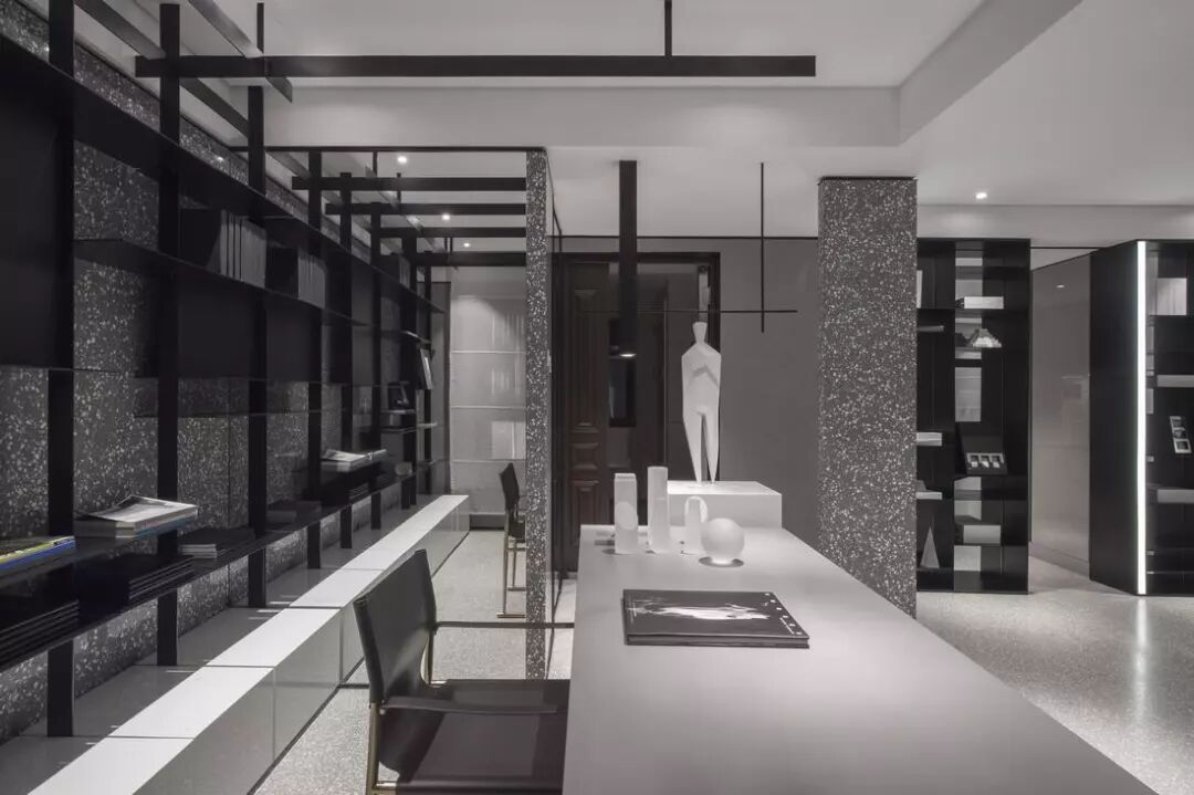 大块面大比例的简约设计,符合自己的习惯。根据生活的核心,在“空盒子”里围绕着工作、放松、娱乐、聚友逐层加入“我”的元素,全开放式格局,黑、白、灰三色主调,水泥、水磨石、金属架等充满阳刚气的材质横行。看起来最不像一个设计师的家,却也最符合一个设计师对家的“放肆”。