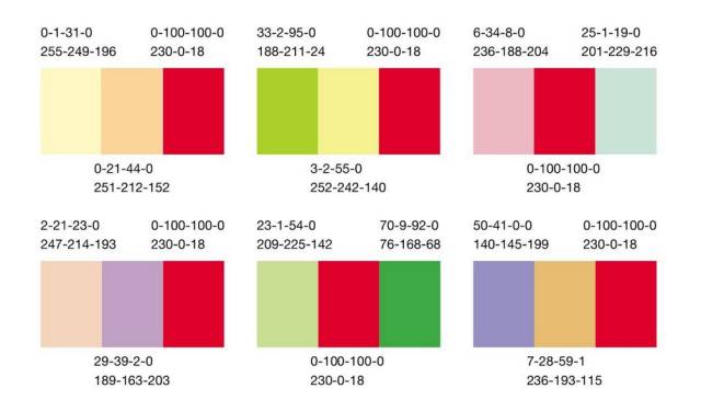 色相对比距离约60度左右,为较弱对比类型,如红与黄橙色对比等。效果较丰富、活泼,但又不失统一、雅致、和谐的感觉。