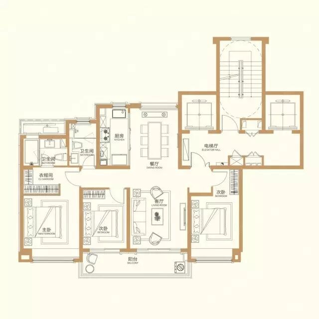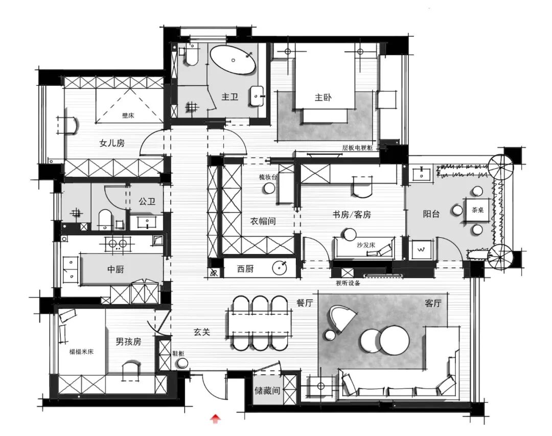 这个案例里的主卧室就很气派,其他空间就有弱化,这就是主次。