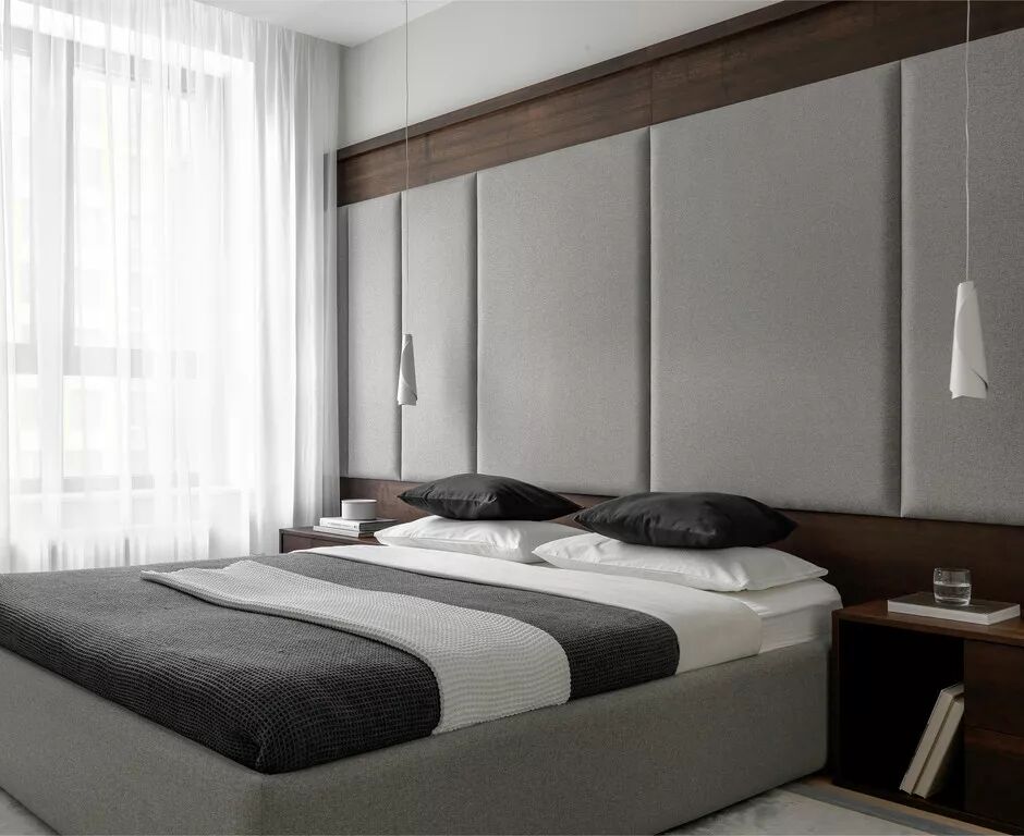 在小卧室中,你可以使用全墙软纺织墙板作为床头板,就像在莫斯科这个项目中一样。此解决方案允许您创建一个连贯、和谐的空间,并在视觉上分离睡眠区域。面板采用与床架相同的材料进行装饰,使其看起来像一套。这里的面料采用深色木材制成,质地优美,与灰色纺织品形成鲜明对比。