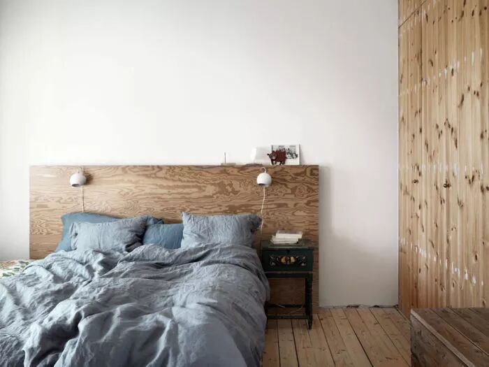 这种床头板可以通过购买一块尺寸合适的胶合板并将其安装在墙壁上而独立制造。如果需要,你可以预先研磨并用污渍或浸渍处理。内饰采用简单的木制家具和柔软的纺织品(最好由棉或亚麻制成)。