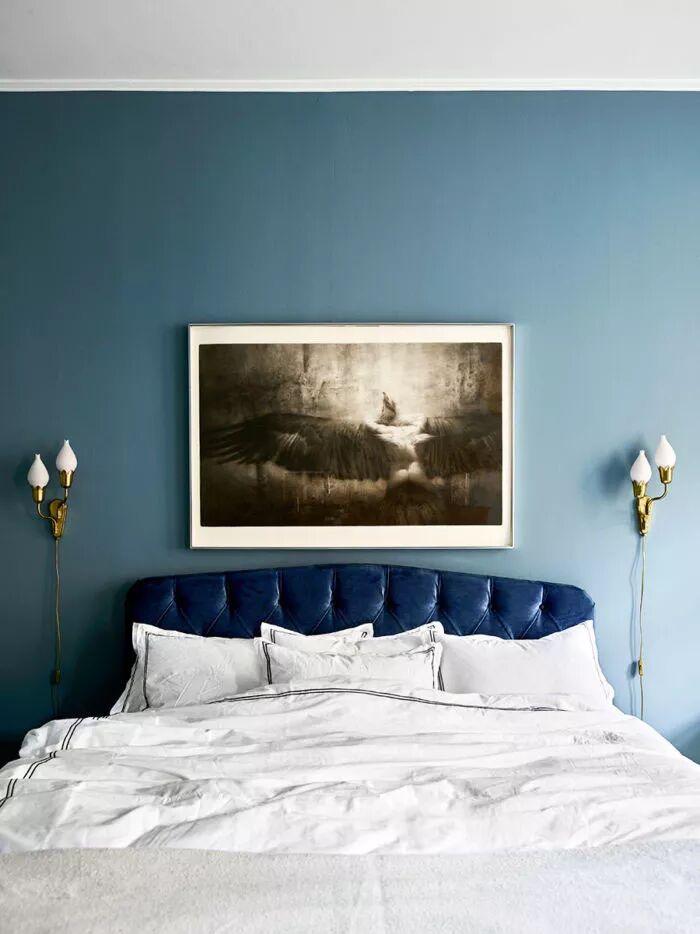 使用同种色系的墙漆颜色和床头板颜色,其目的是在卧室创造和谐。在这个案例中,床头板上的深蓝色天鹅绒,让人联想起豪华酒店的房间。