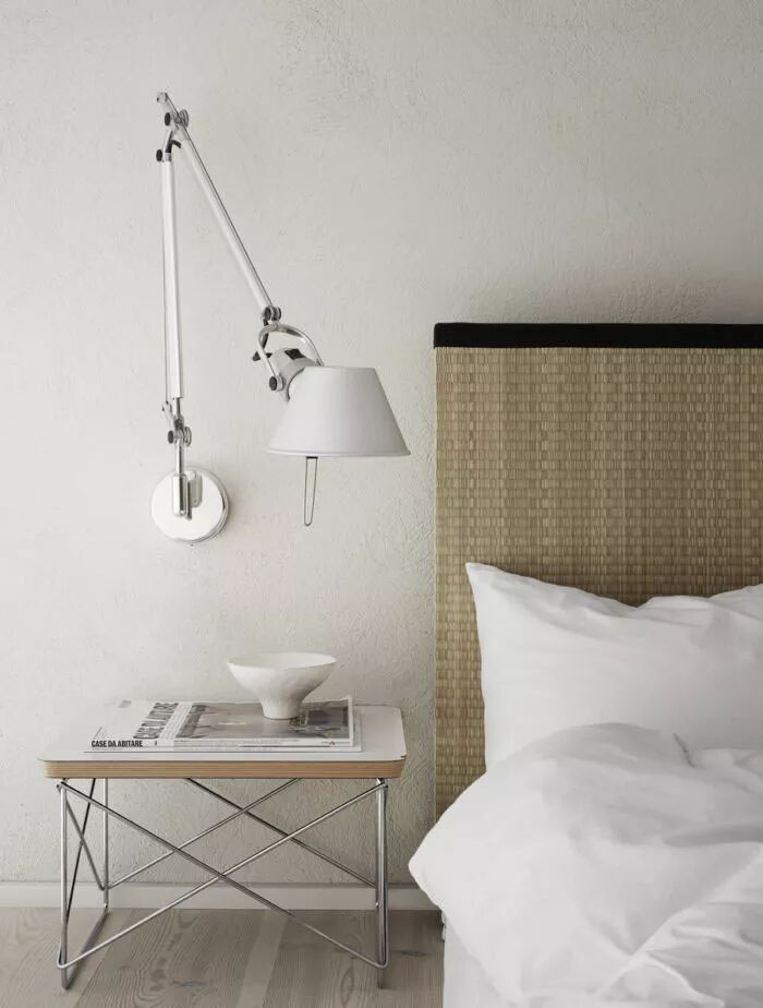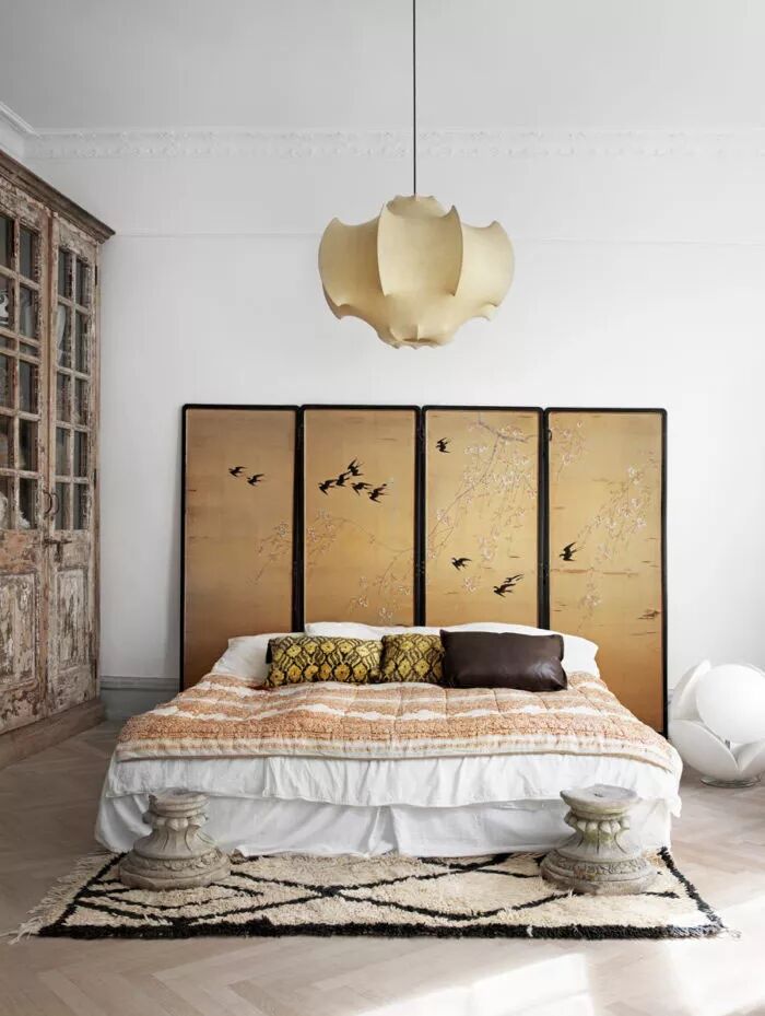 没有必要使用经典的床头板,你可以展开一点想象力,例如用天然丝绸覆盖的东方风格屏风取而代之。在浅色墙壁的背景下,它看起来像一件艺术品!如果你愿意,您可以随时从床后面更换屏风并将其用于预期目的,方便又漂亮。