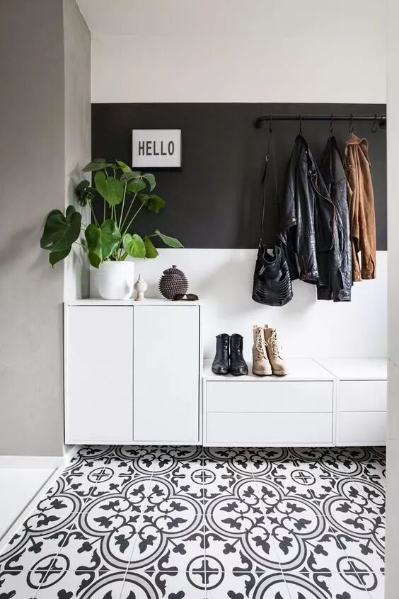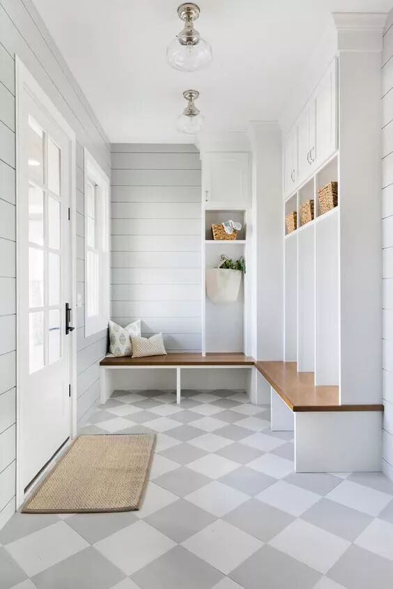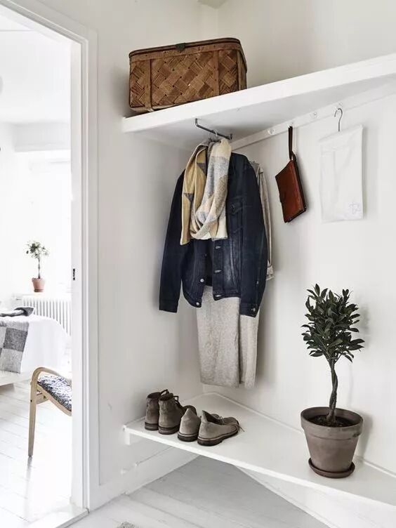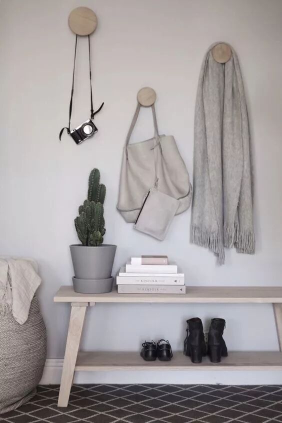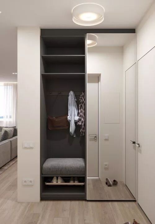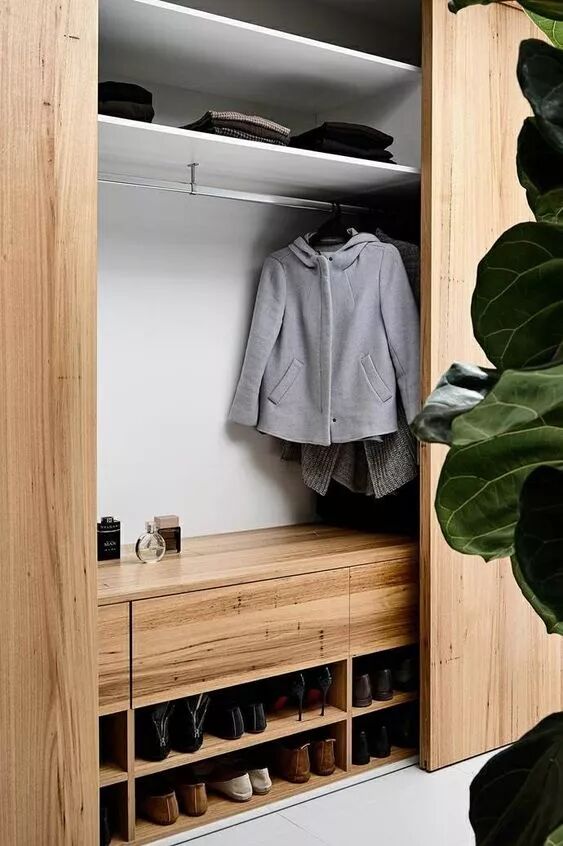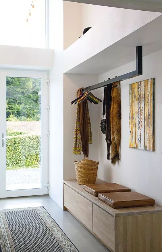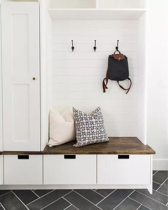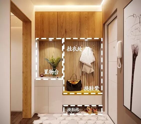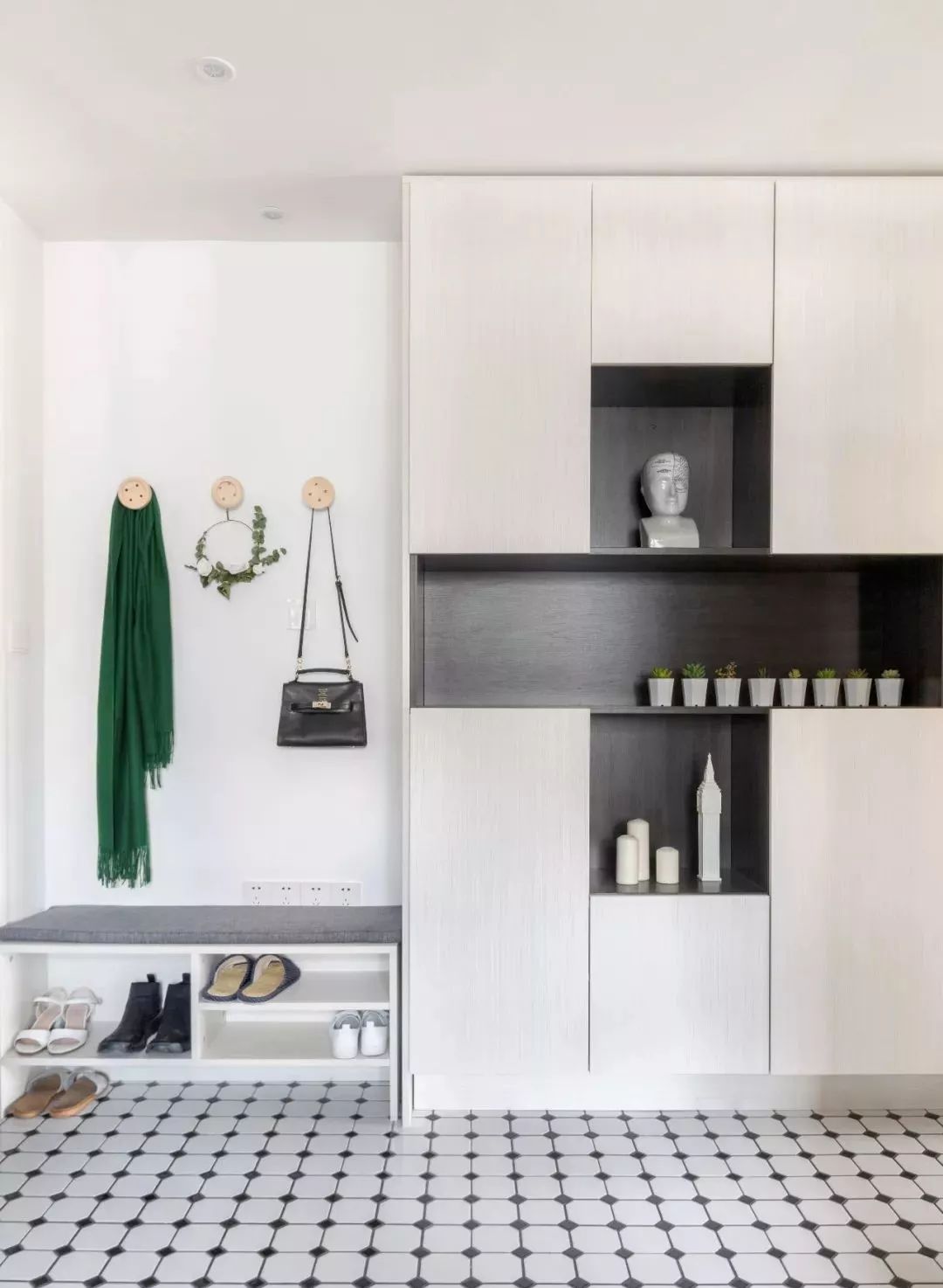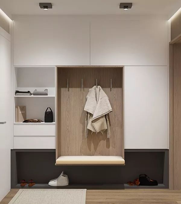 即使在简单的门厅中,也一定要有换鞋凳,尤其对于有孩子与老人的家庭,所以在门厅直接放个凳子,然后以此为基础进行四分式设计,其实也是不错的个性设计。不建议设置折叠式和嵌入式的换鞋凳。