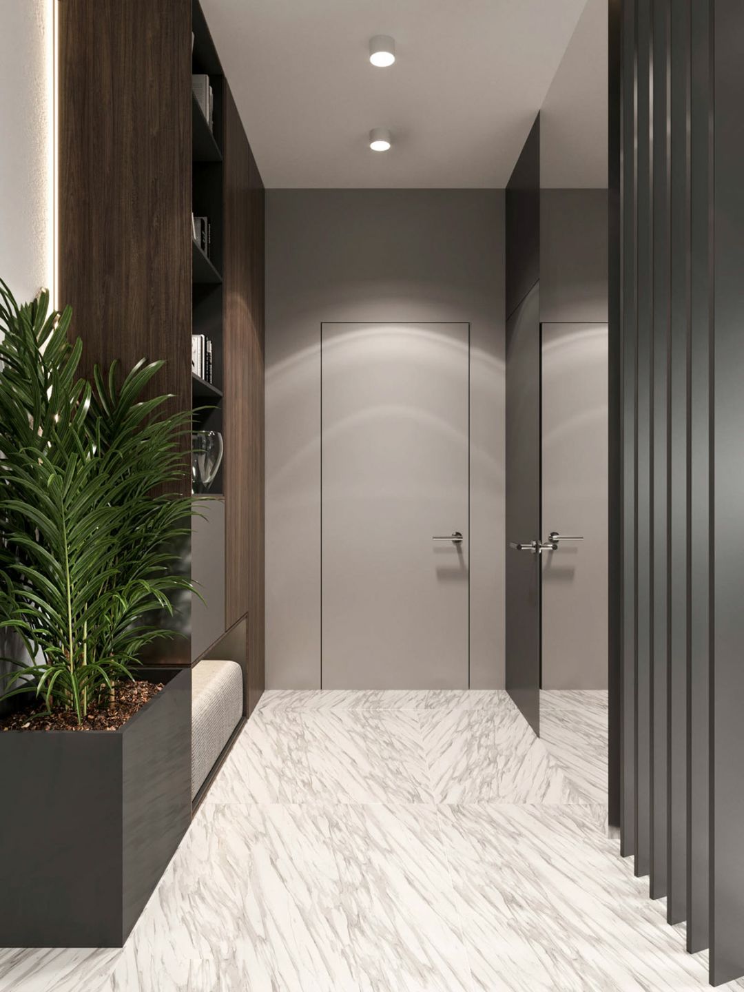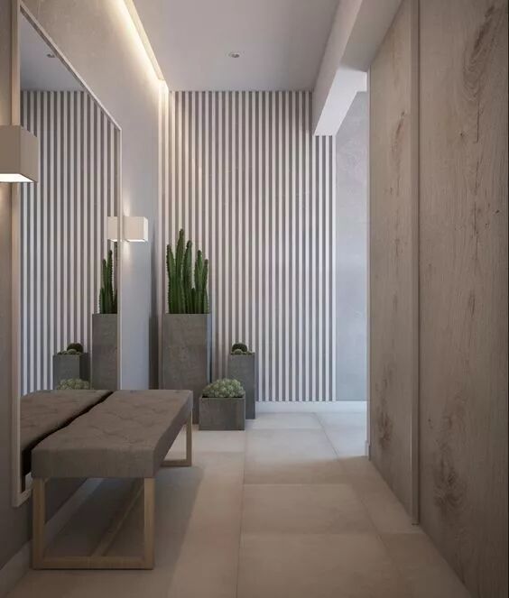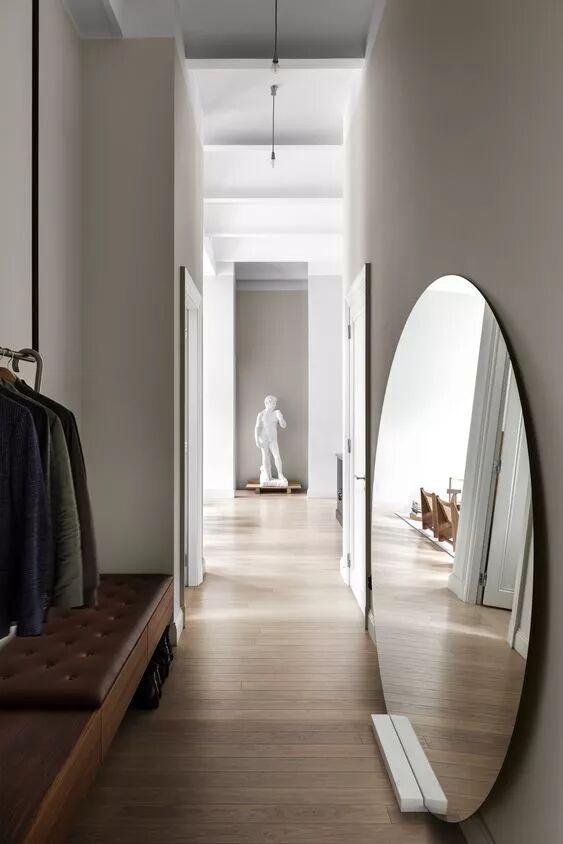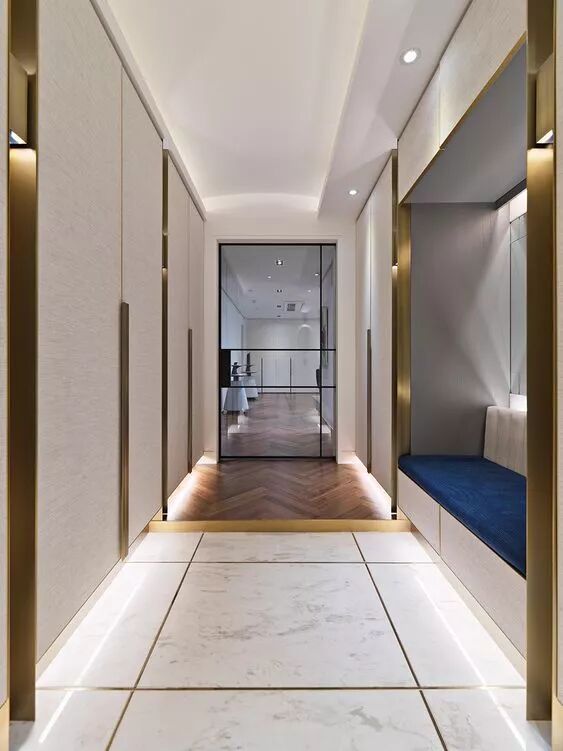 一般情况下,大多数人还是会选择在门厅一面墙的位置,放置大量的柜子,可以将镜子放在柜子的对面,有效的增加空间的延伸感。