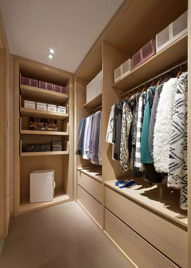 3、收纳盒:对于一些小件的零星物品,可以用麻质储物篮、精美的纸盒来收纳。转角位置的衣柜可以放置一些较大的杂物箱,或者放置常用的箱包让转角可以合理利用。