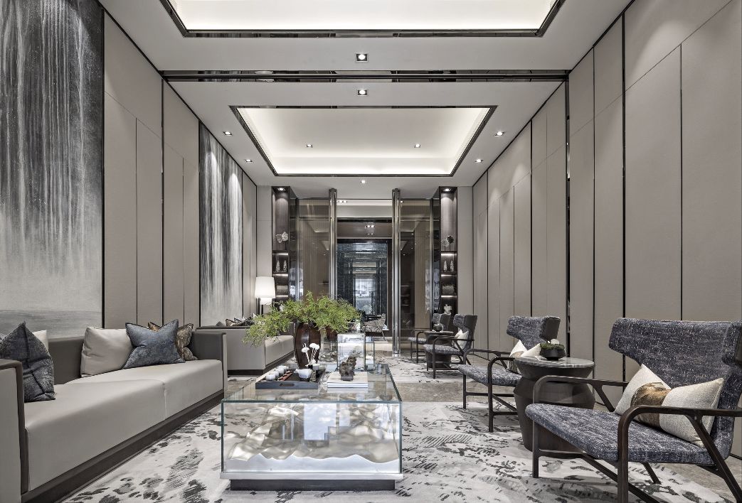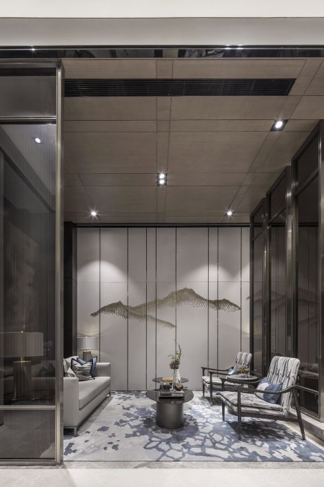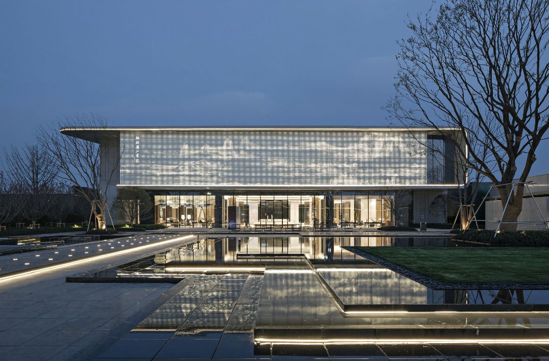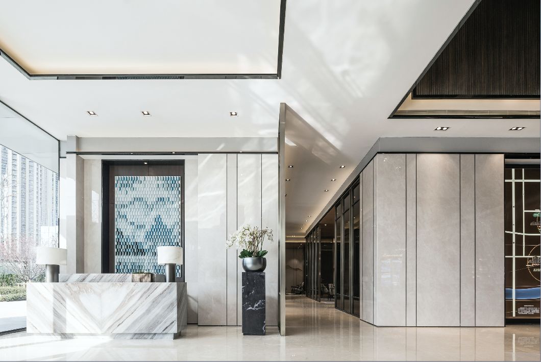 前厅接待区与建筑外观相呼应,统一并且有强烈立面感的空间关系,融汇成了一处具有进深感、内外交融的无界山水空间。