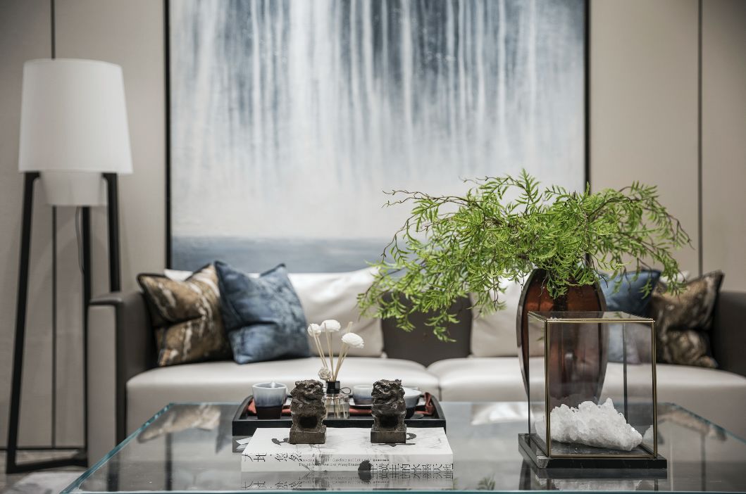 米灰色调的大胆运用,铺垫了这里温润柔和的基调,局部洋洋洒洒的灰蓝墨色,进一步渲染了雅致悠然的艺术氛围。