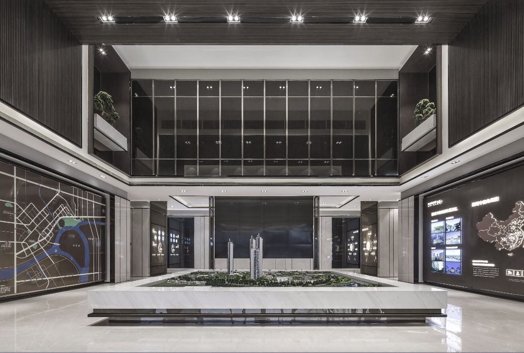 沙盘区视觉通透,为延伸空间错落感,设计相应提升天花标高,使观者进入空间,体会到恢弘大气,意境深远。深色木质搭配米色石材,层次分明而浑然一体,刚柔并济、寓情于景的灵动画卷徐徐展开。