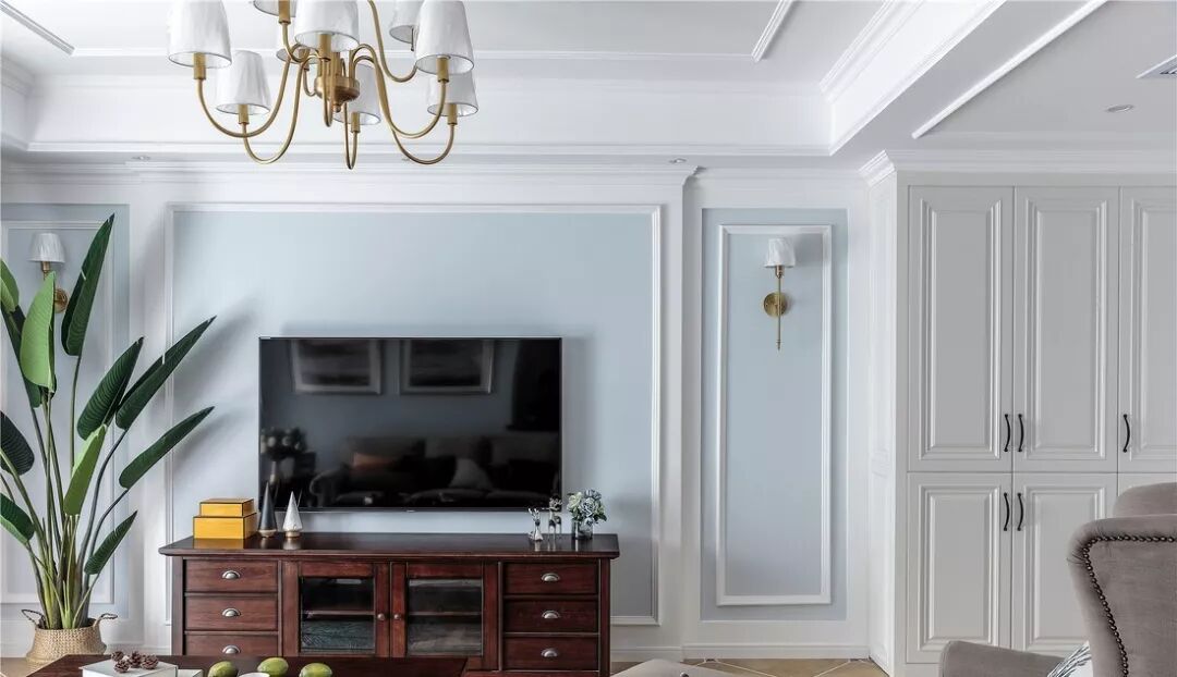 ▲美式风格经常会用石膏线条做造型,最常见的是三分造型,壁灯和斗柜也是常用搭配。