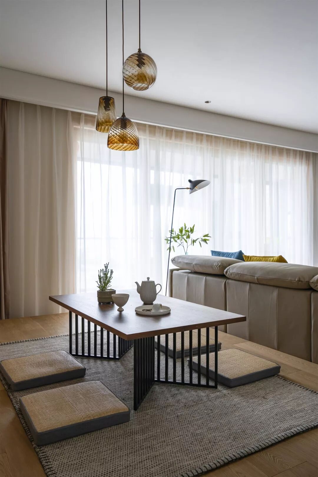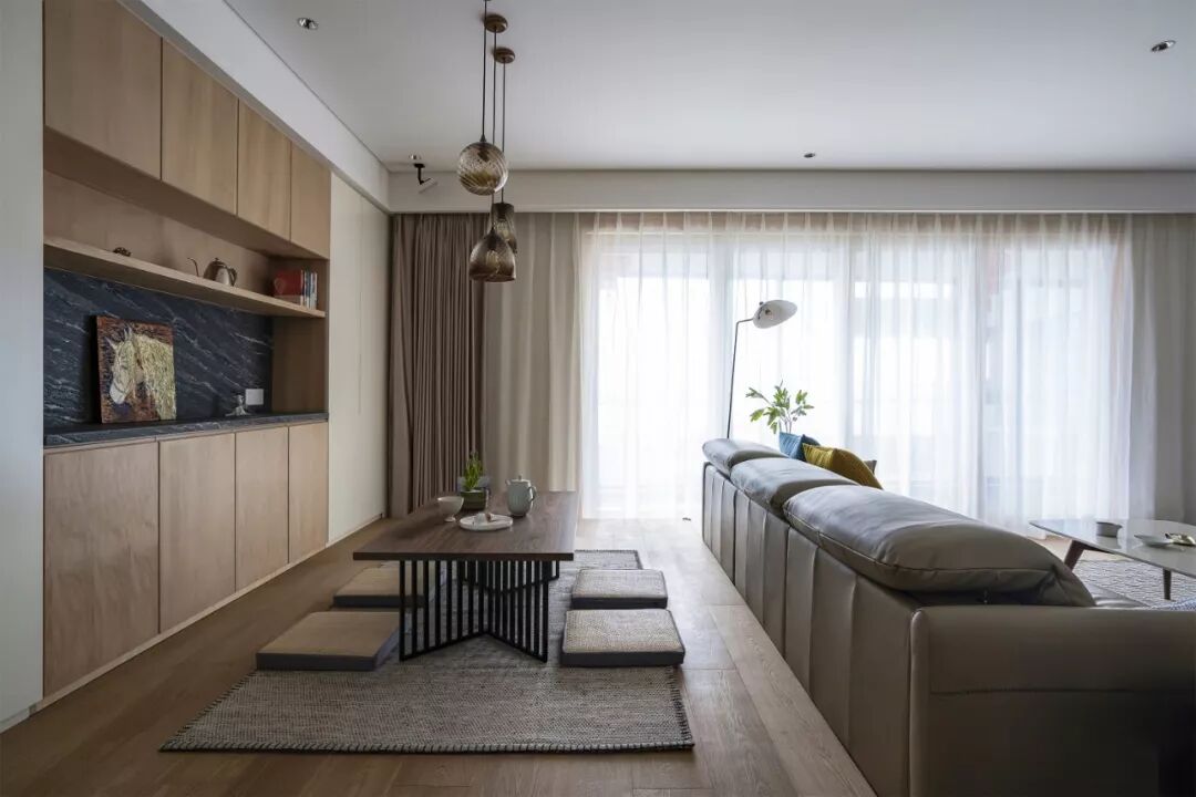 客厅与休闲空间在软装上做了功能分离,既彼此独立又互相依存。一张茶桌,松软的坐垫,用心臻选的茶具,一株绿植,设计在有限的空间内构建起日常的诗性,去安放居者的灵魂与情感。