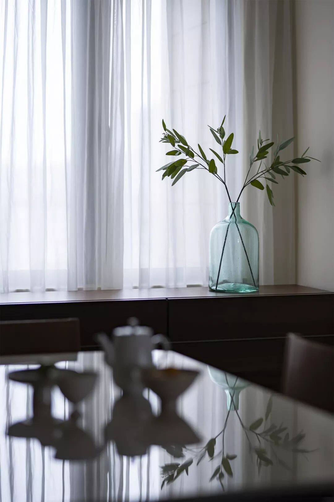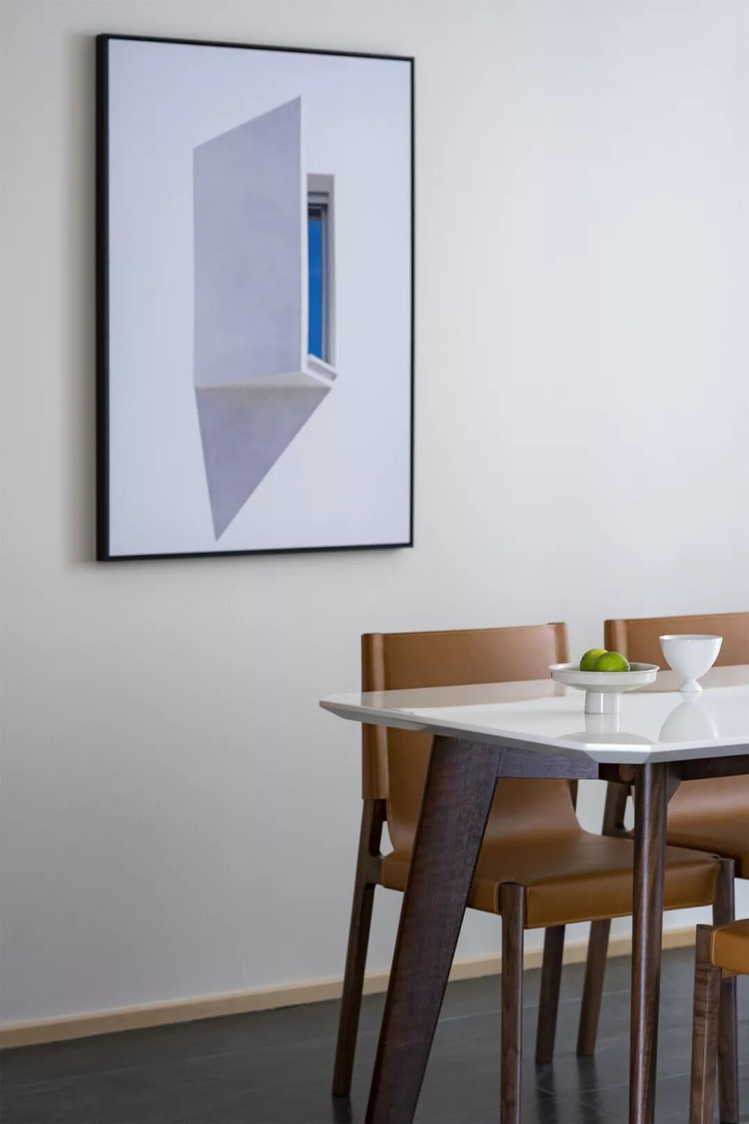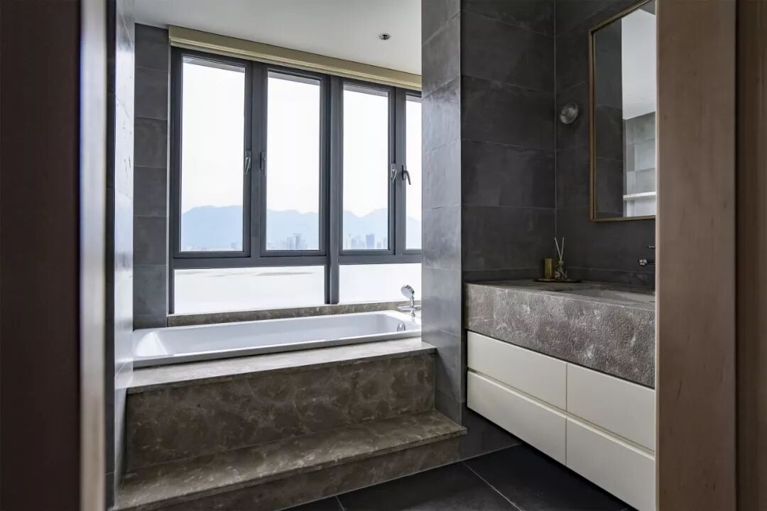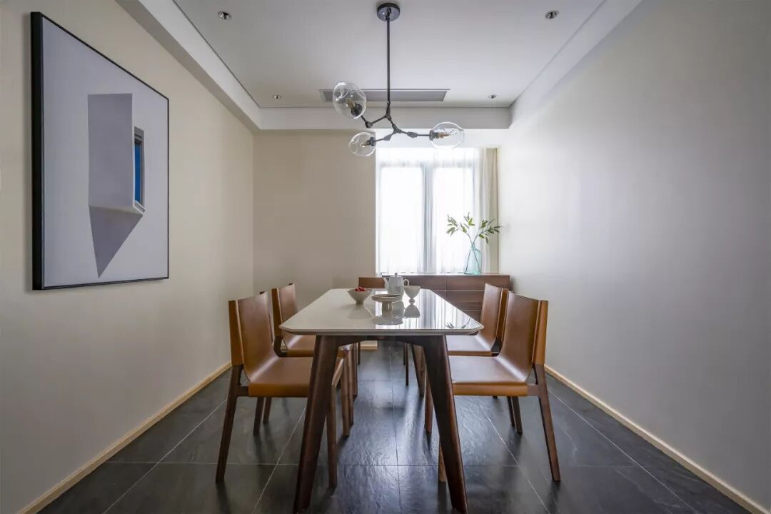 餐厅延续客厅干净利落的基调,深灰色大理石地砖将空间的质朴凝练放大,营造出如清风般让人平静放松的氛围。