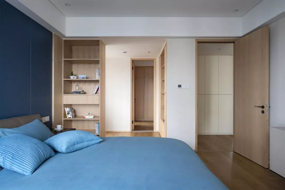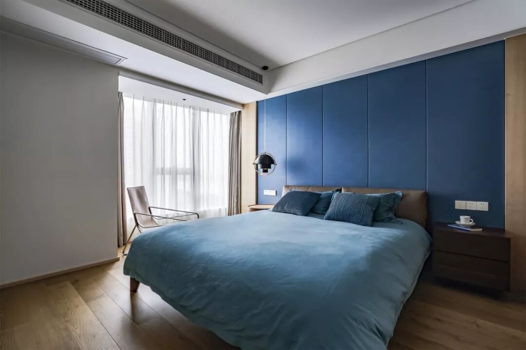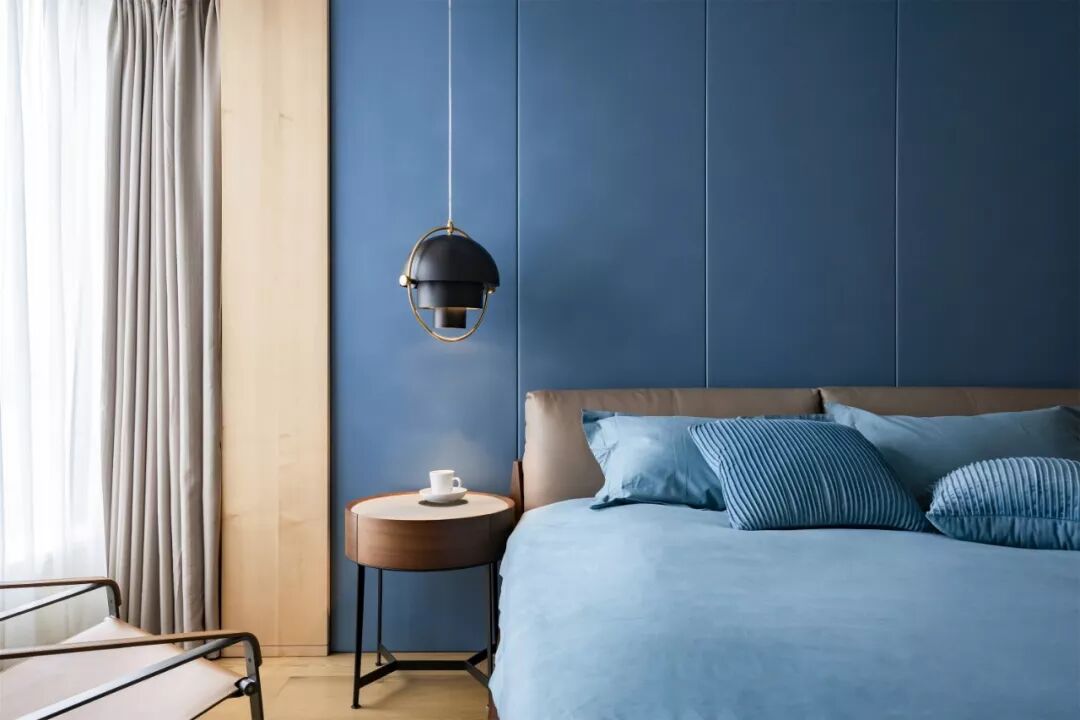 主卧,天空蓝塑造空间沉稳平和的气质,配合皮质大床、吊灯及休闲椅,利落的搭建起生活的品质感。