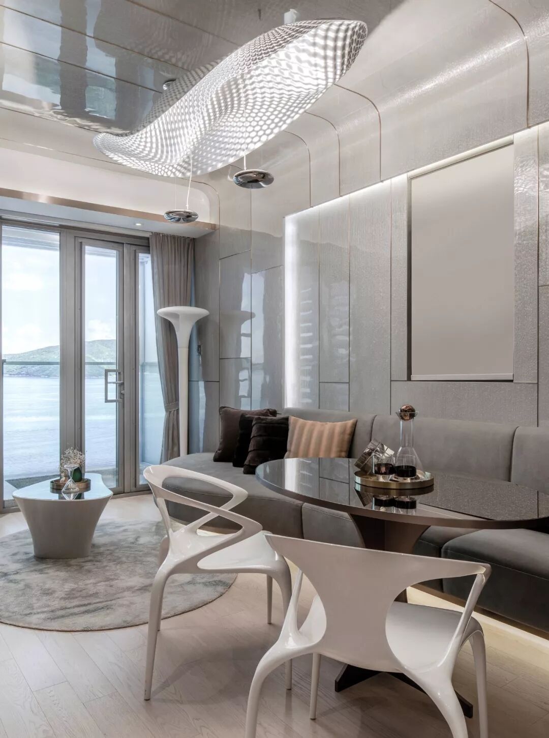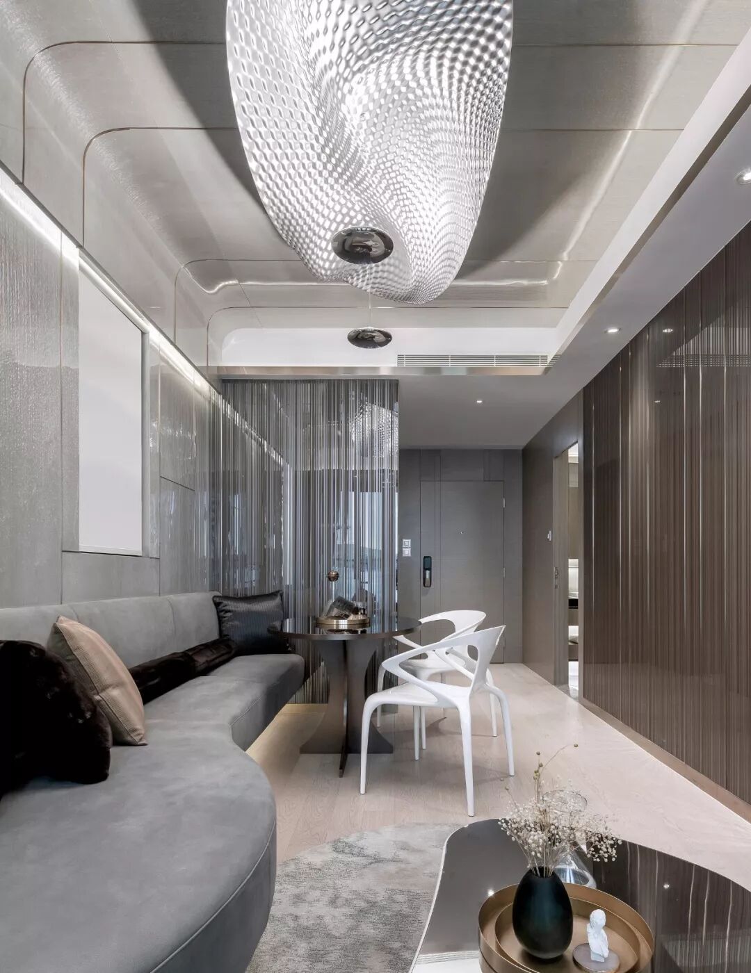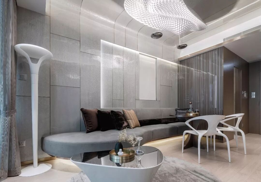 灰色的基调,浅灰更显年轻。搭配暖色的地板及灯光,更具人情味。沙发、茶几、桌椅、吊灯大胆采用弧形线条,张扬又有艺术感。人生匆忙,何不停下脚步,静听涛声。