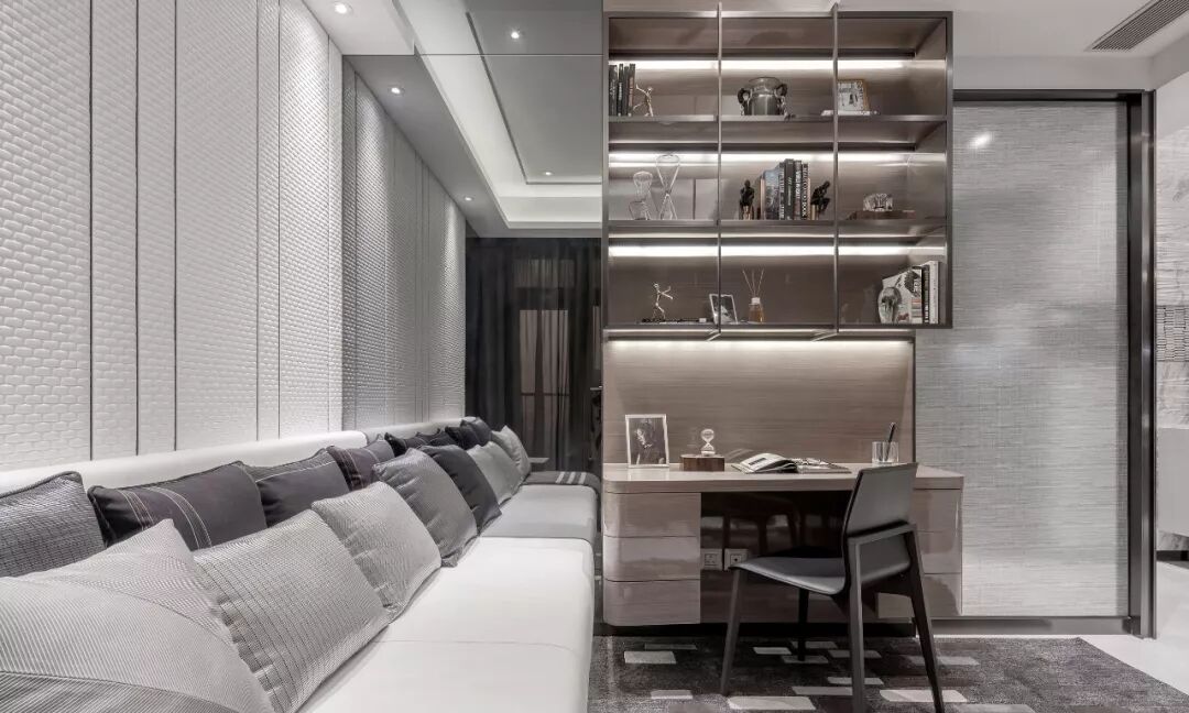 穿堂而过,是一间多功能书房,仍以灰白两色为主,但在材质的选择上更趋柔和,布艺沙发、毛绒地毯、浅棕色书桌,着重舒适感。