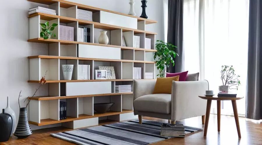 可以采用内嵌式或者内藏式的收纳家具,避免过多物品收纳在外阻碍视觉,墙上搁板收纳不宜过多,一面墙足以。