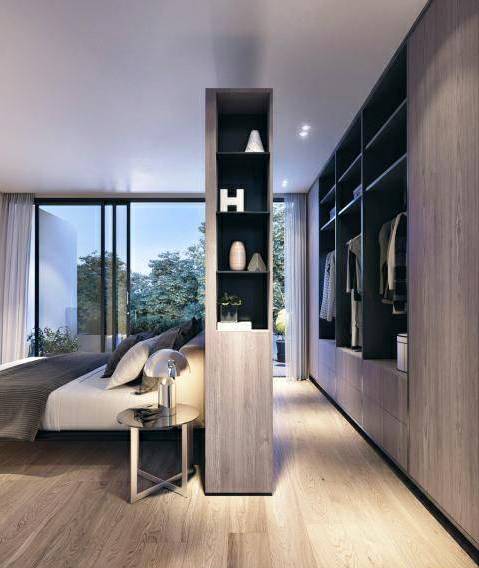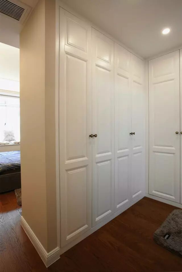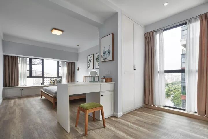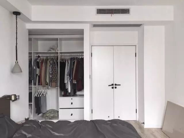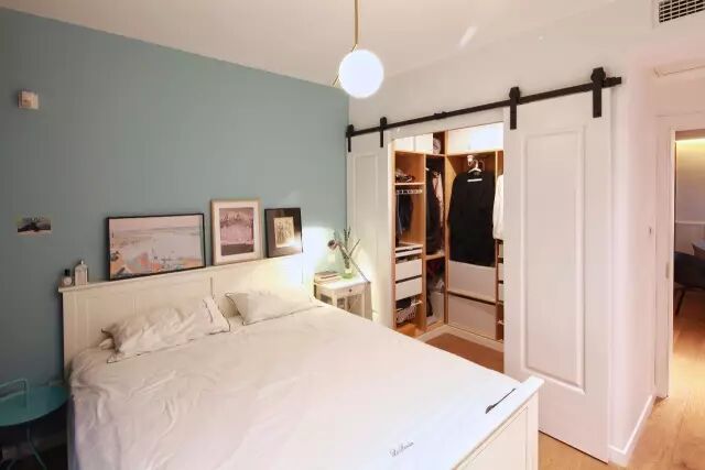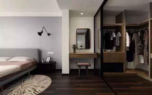 卧室里某一面墙较大的,可以把它利用起来装成一整面的衣帽间,甚至可以通过开放式的挂钩等形式,来实现自己梦寐以求的衣帽间小梦想;
