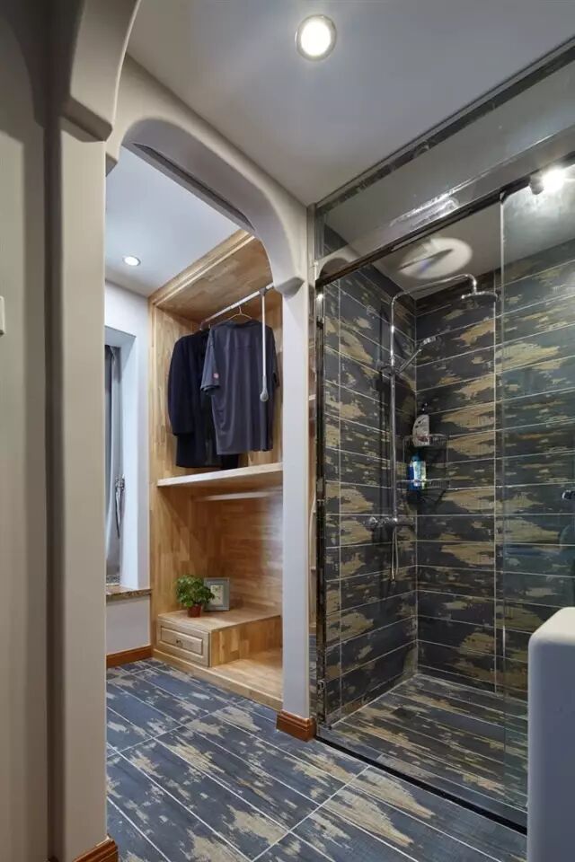 主卫的通道,甚至是卫生间原本的干区,可以改造利用起来,把主卫门外的两侧装成步入式衣帽间,这样利用也是相当的不错,各位可以借鉴;