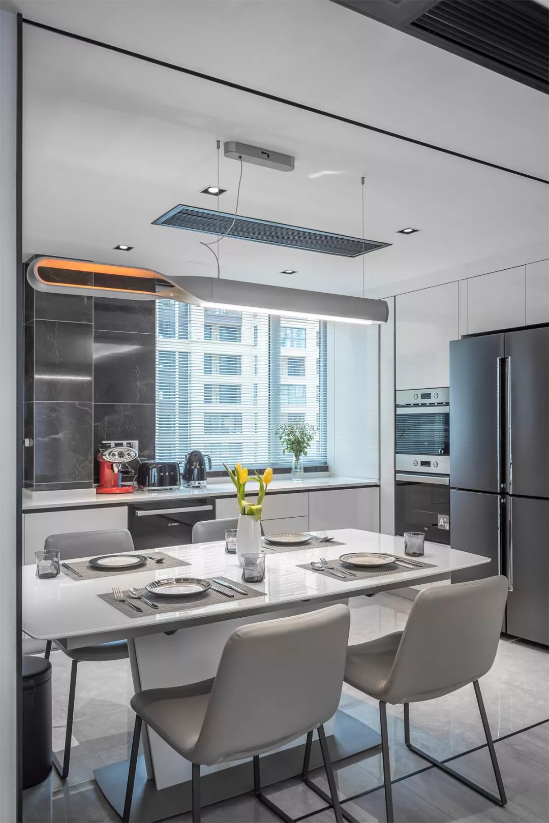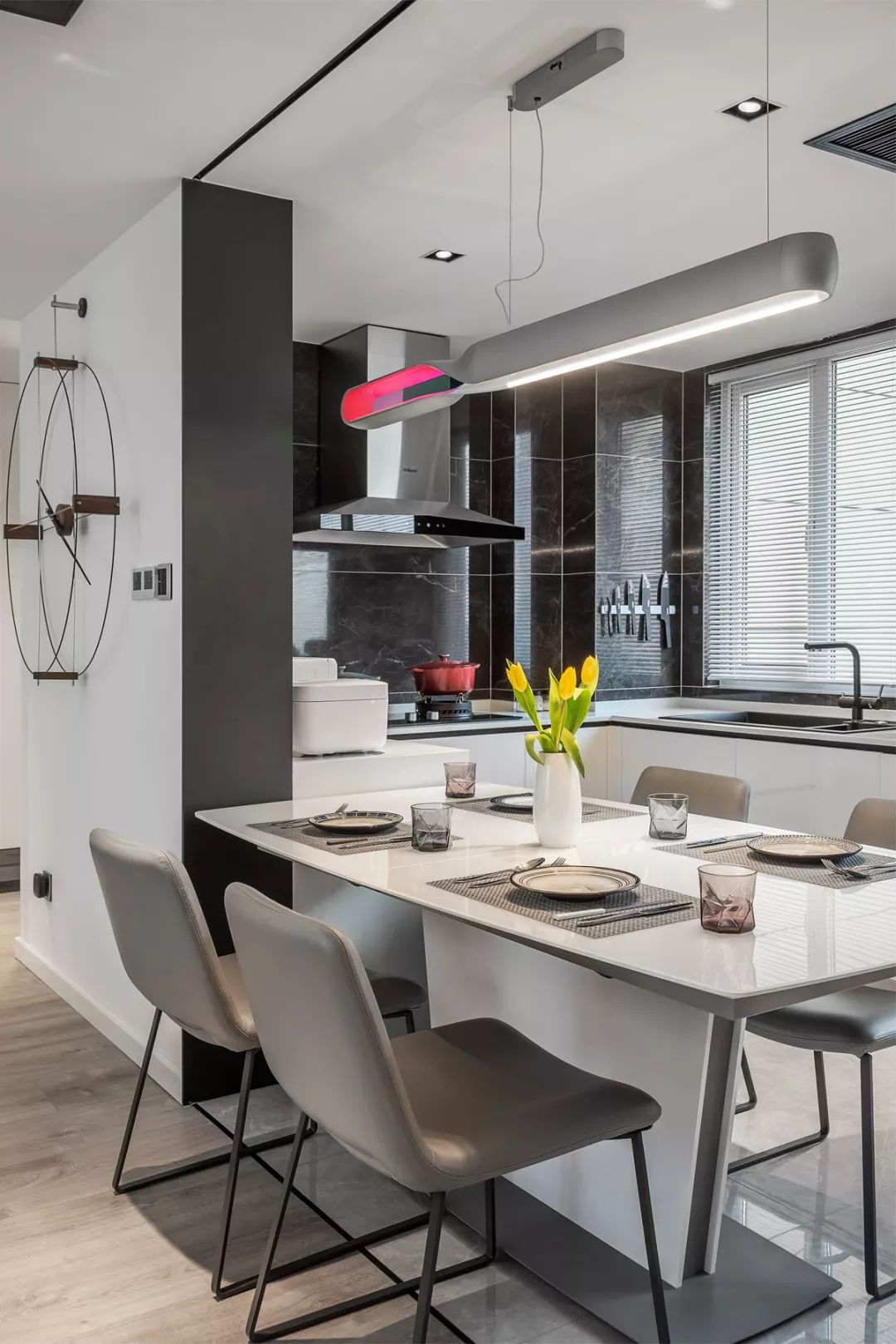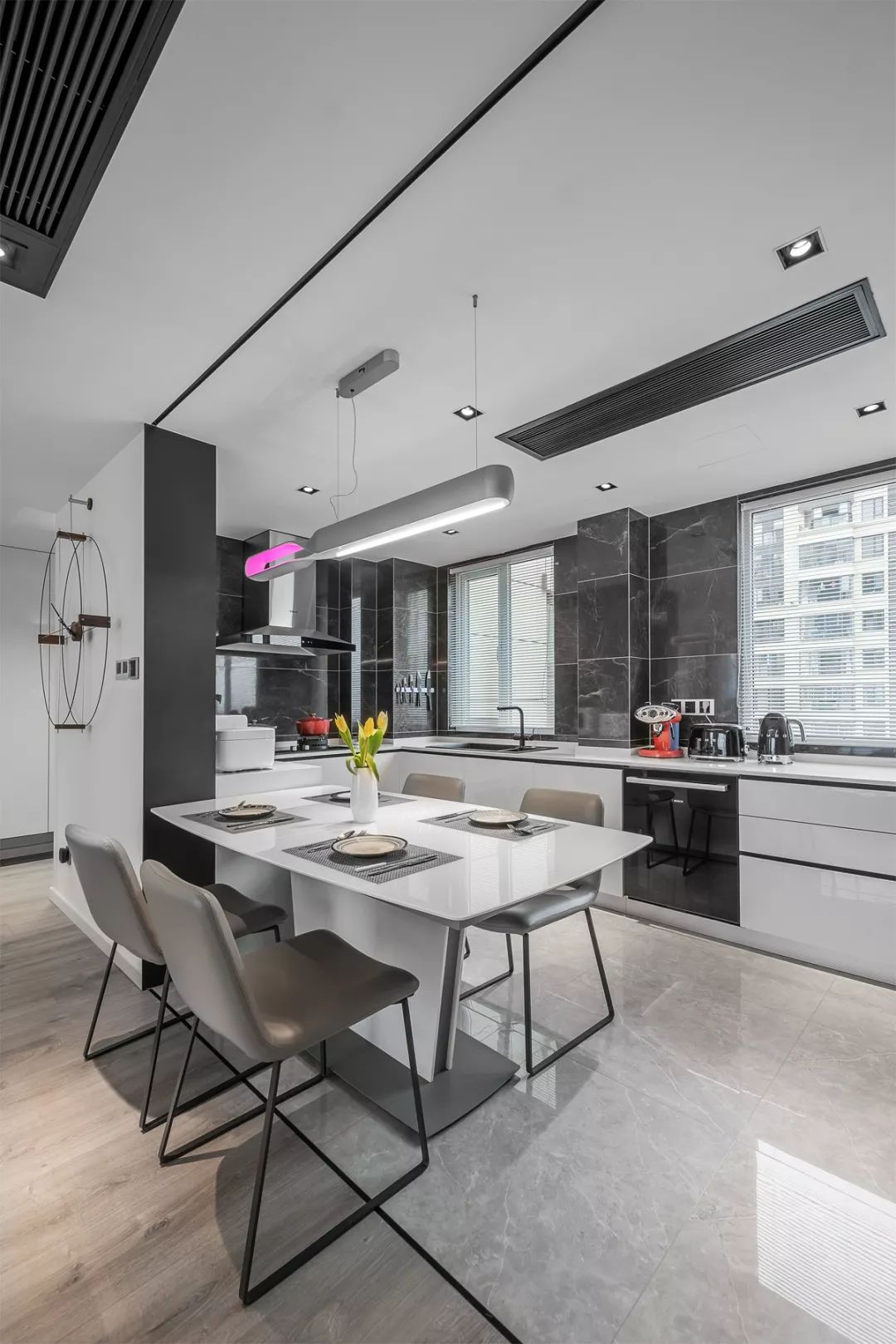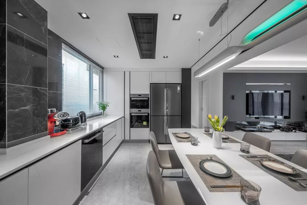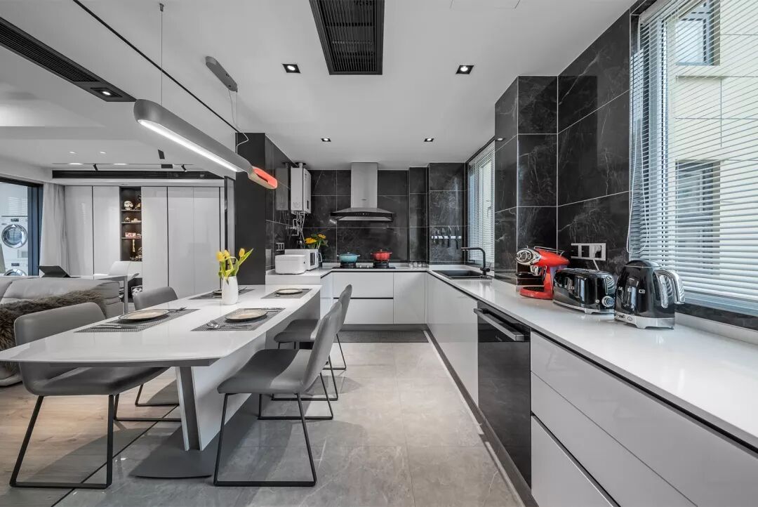 开放式餐厨一体化厨房设计,也是本案一大亮点,依然延续黑色和深灰色搭配的路线。