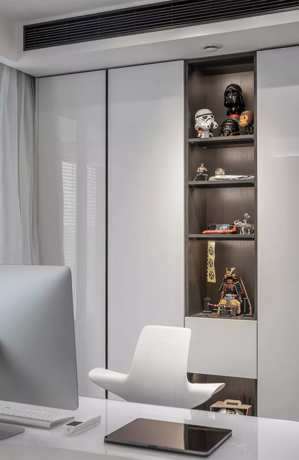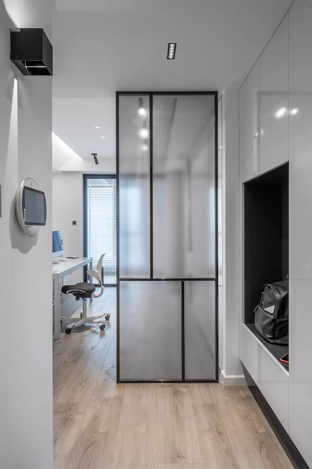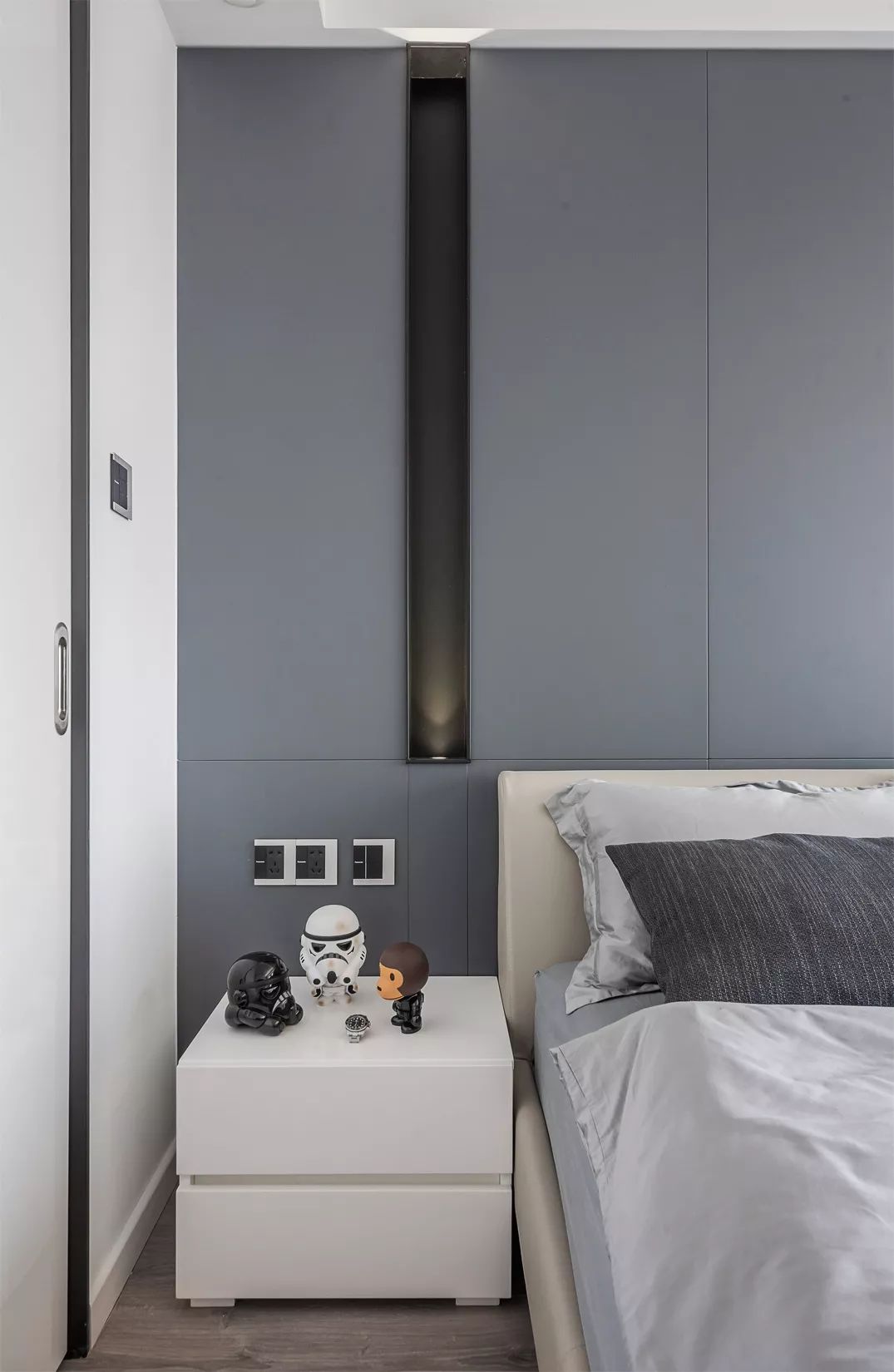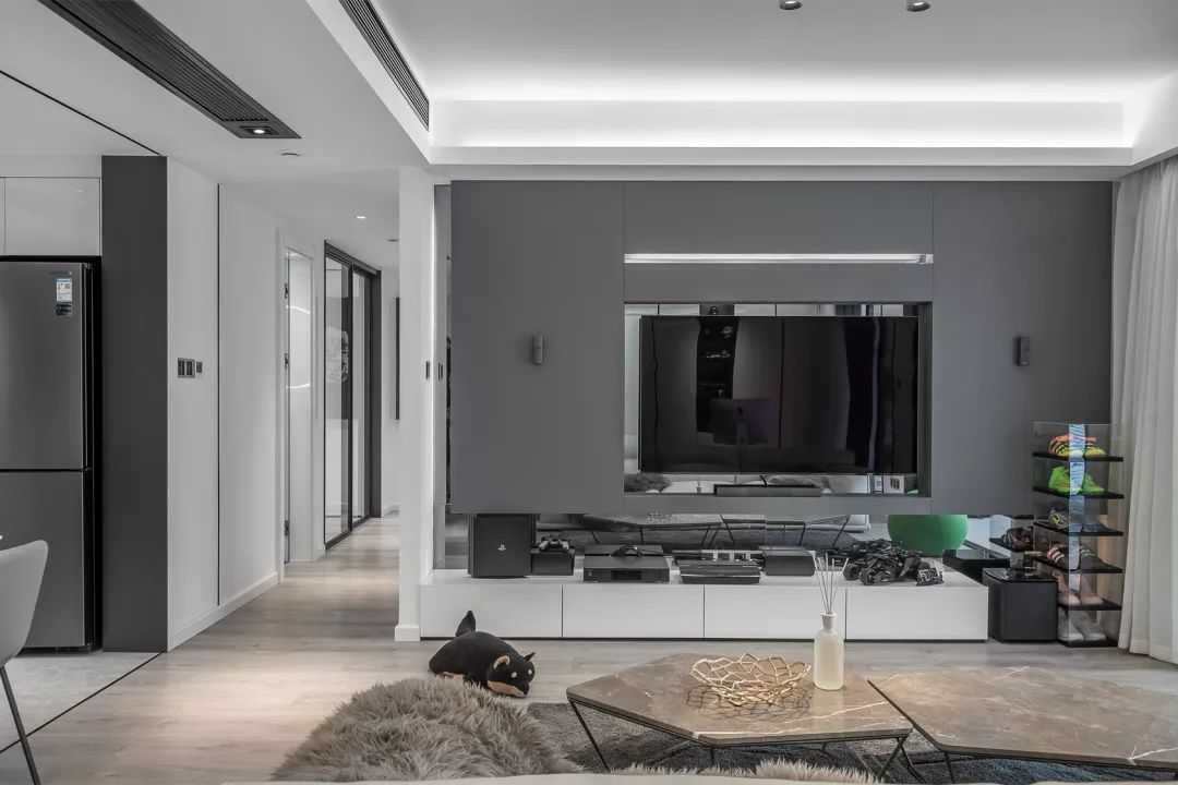 从另外一个角度看过去,依然非常有型。白色柜体于深灰色的凹入空间形成对比,产生视觉冲击力。