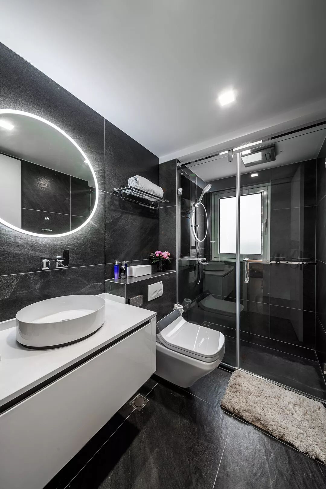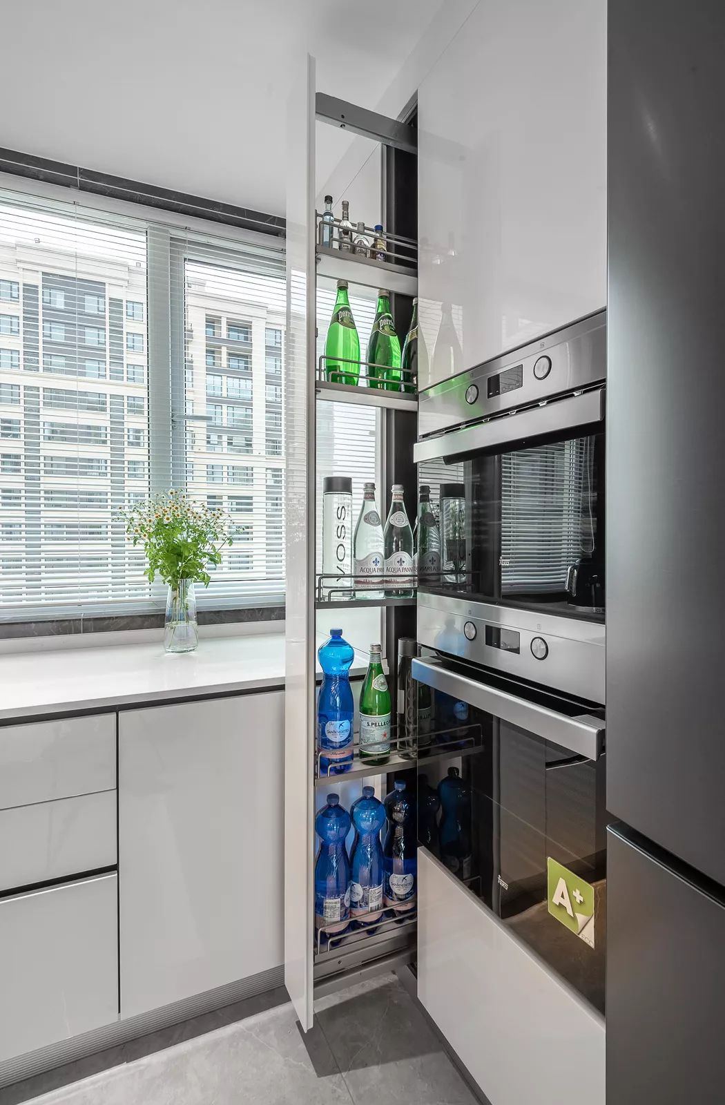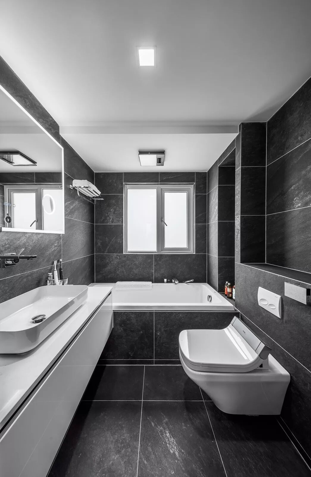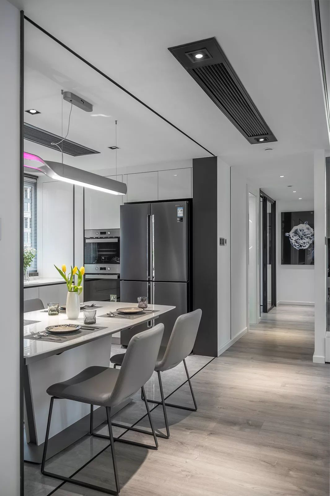 从另外一个角度看过去,依然非常有型。白色柜体于深灰色的凹入空间形成对比,产生视觉冲击力。