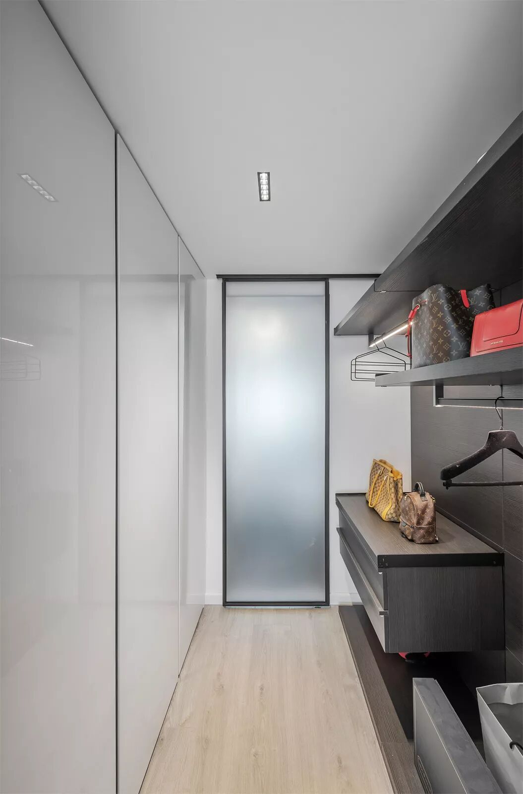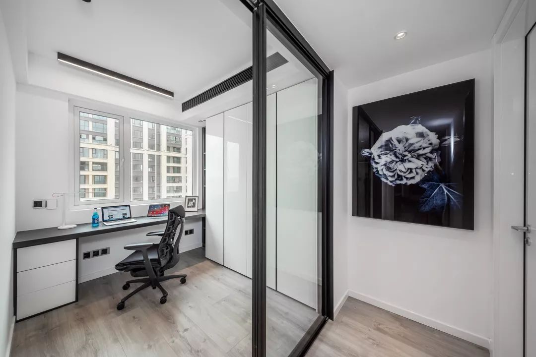 主卧室设计了一个衣帽间,材质特意采用玻璃反光材质,增强空间的质感于光泽感。
