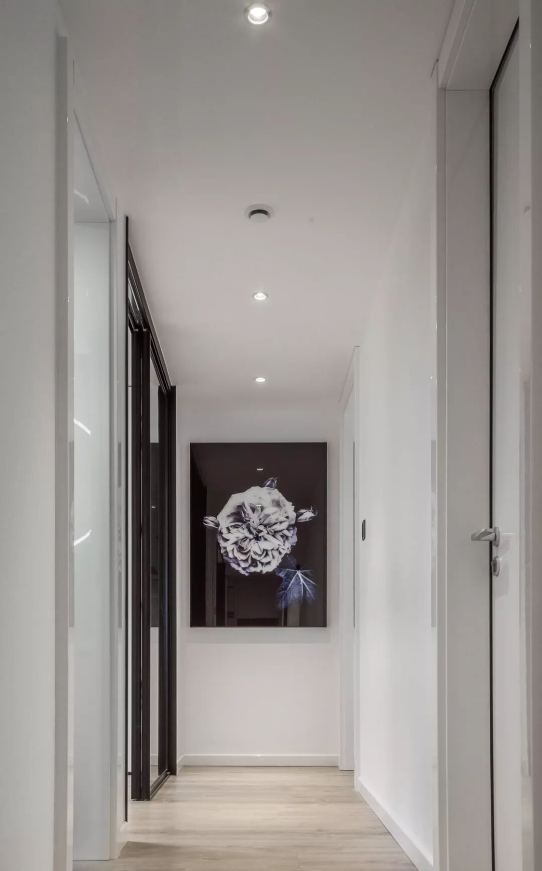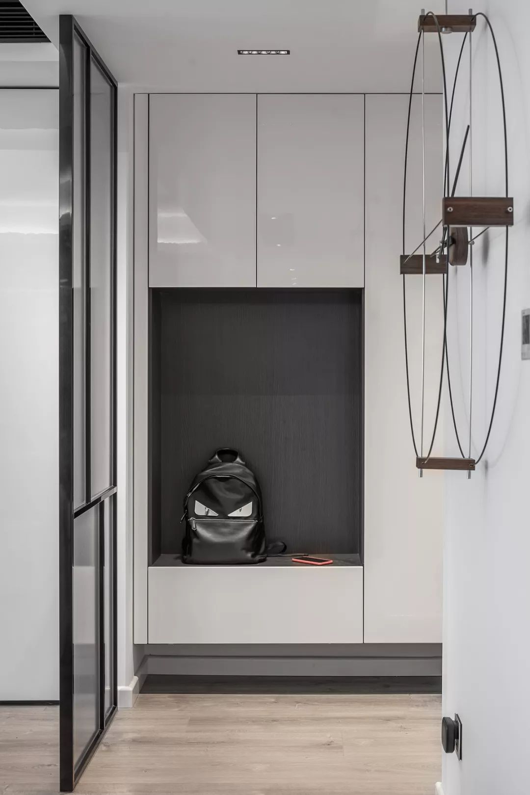 玄关设计力求简洁实用,考虑收纳于美观的兼容性,因此隔断设计非常简单,而右边衣帽柜,综合了换鞋,开放式储物以及挂衣服的需求。