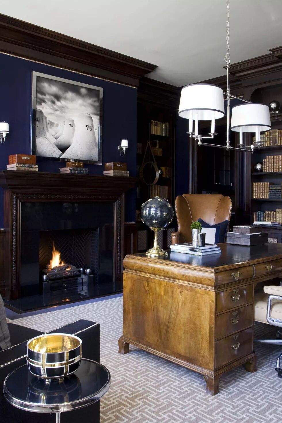 SB Long Interiors的海军家庭办公室受益于时尚的黑白摄影。