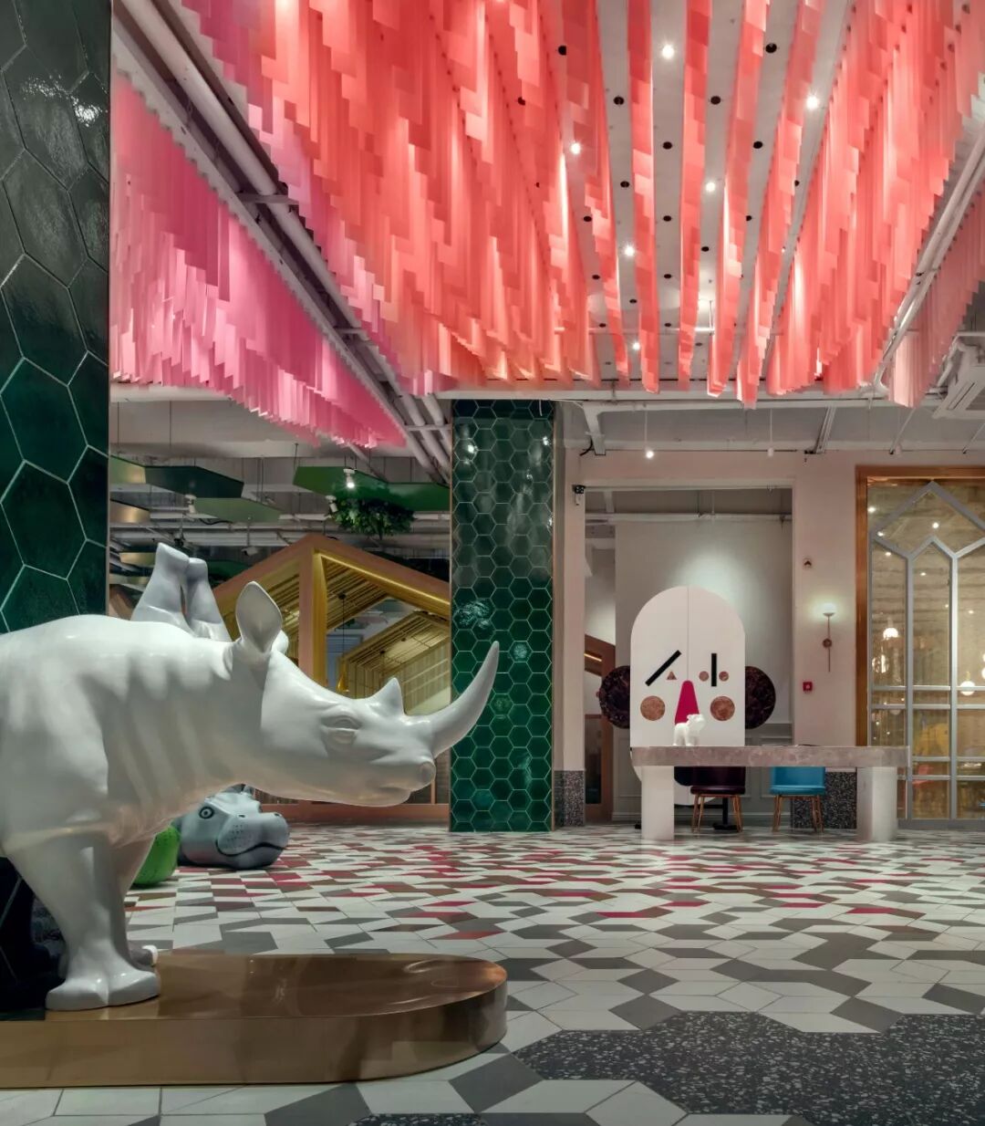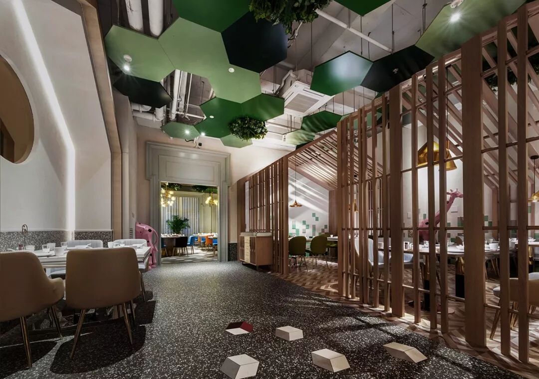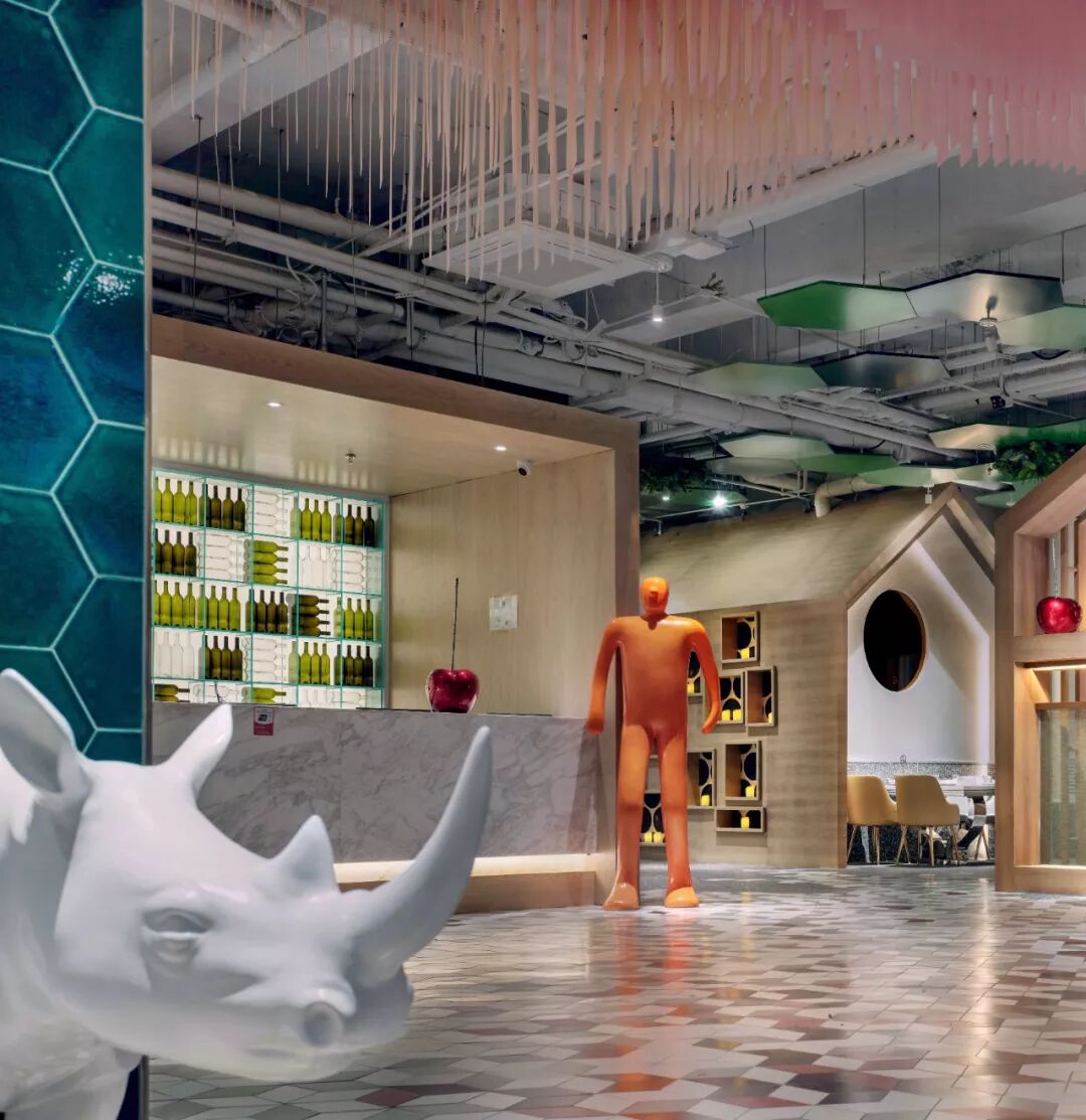 “小丑的天堂”是设计师伊振华反复打磨出的设计理念,平等、开放的就餐空间,没有商业化的年龄定位局限,来到这里每个人都可以卸下社会角色的防备,除去仪式感和形式感,像舞台上彻底放松、肆意释放的小丑一般,表达真我的快乐。