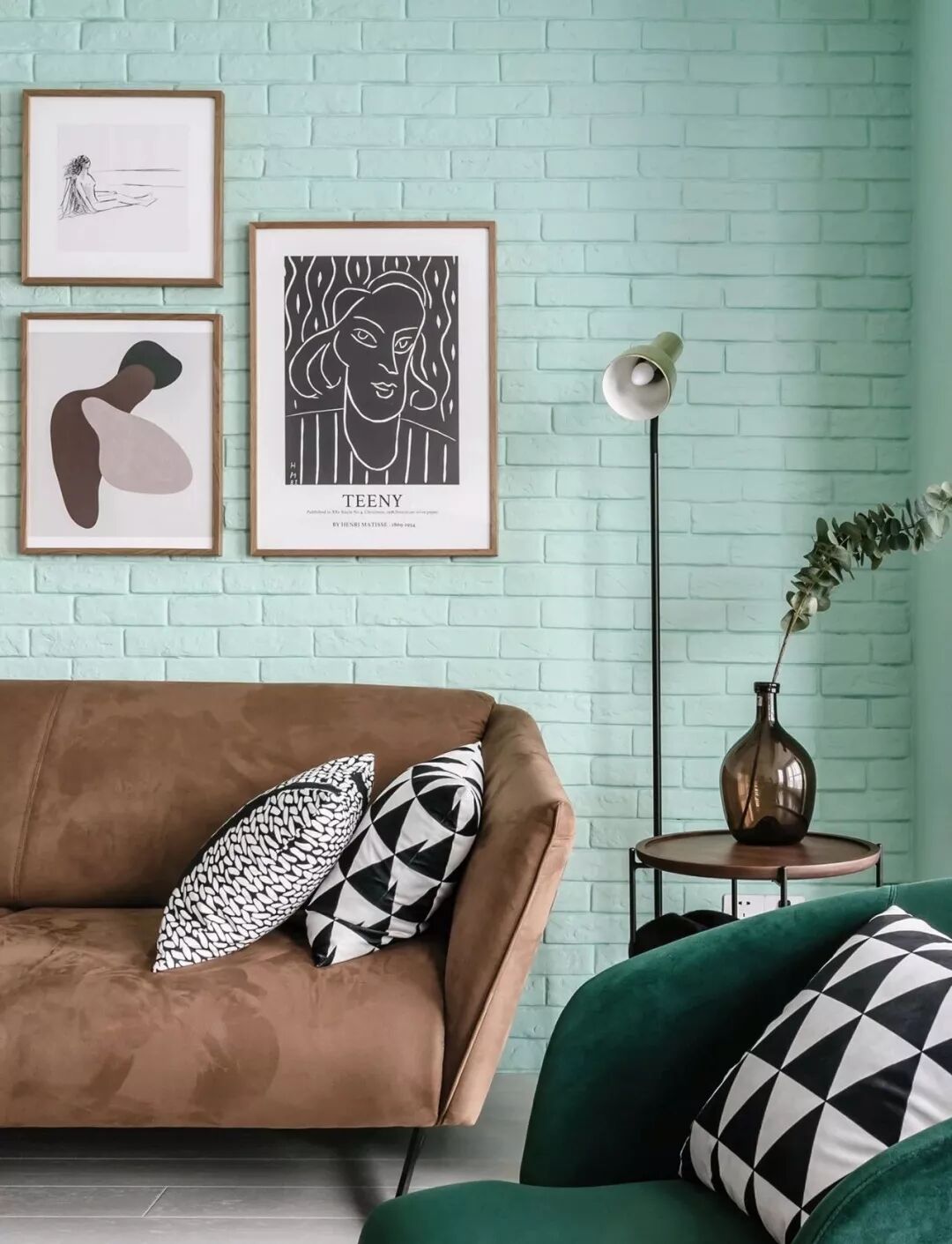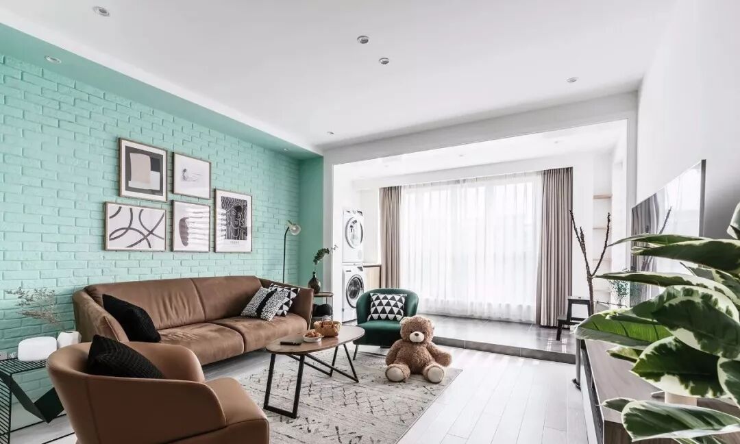 ▲ 客厅沙发背景墙使用文化砖,配上清新的薄荷绿,舒适的家具,在多元素的装点下,达到一种平衡状态,和谐有趣