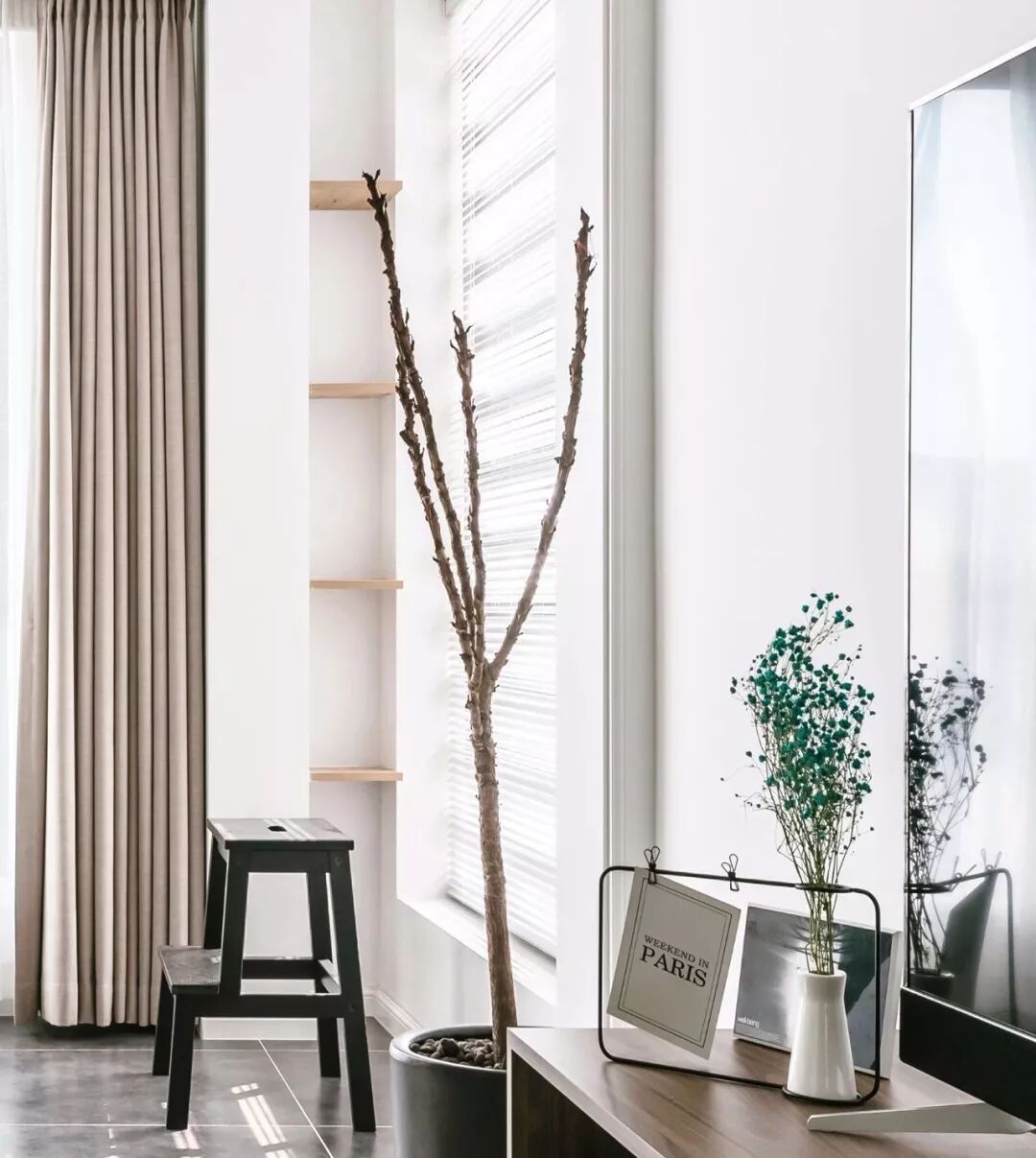 ▲ 打通后的阳台,以加高地台的方式划分场域并增加空间层次,利用墙面的犄角旮旯,加上木板,既是装饰又兼具储物功能