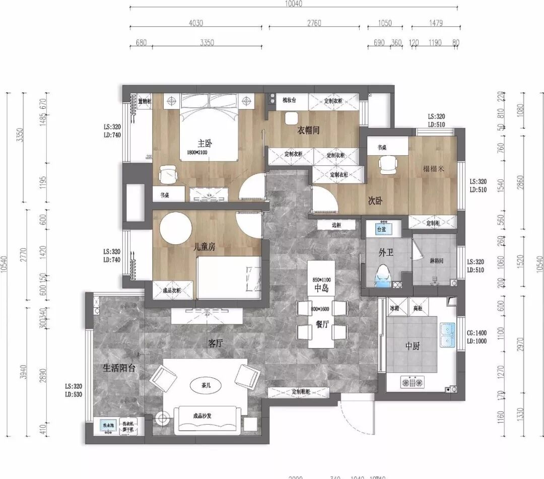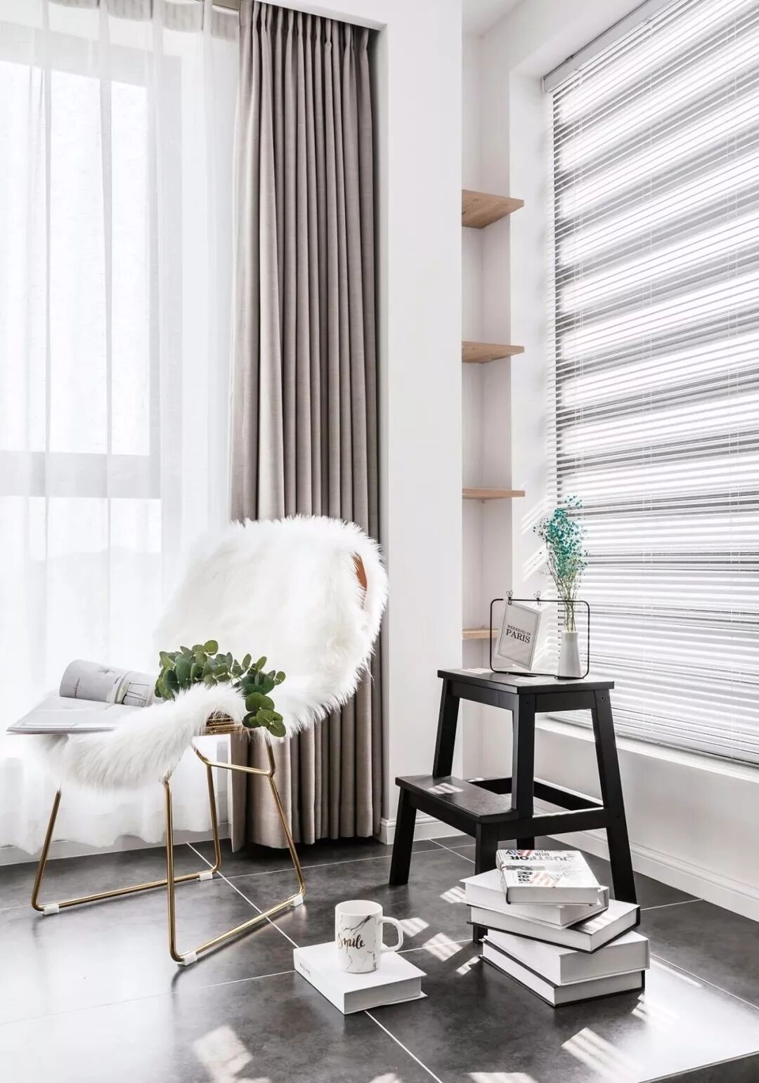 ▲ 透过窗户,阳光倾洒入室,深灰色地砖、灰白色木地板完美承接大自然的过渡,打通阳台与客厅的好处,增大采光,也开阔视野