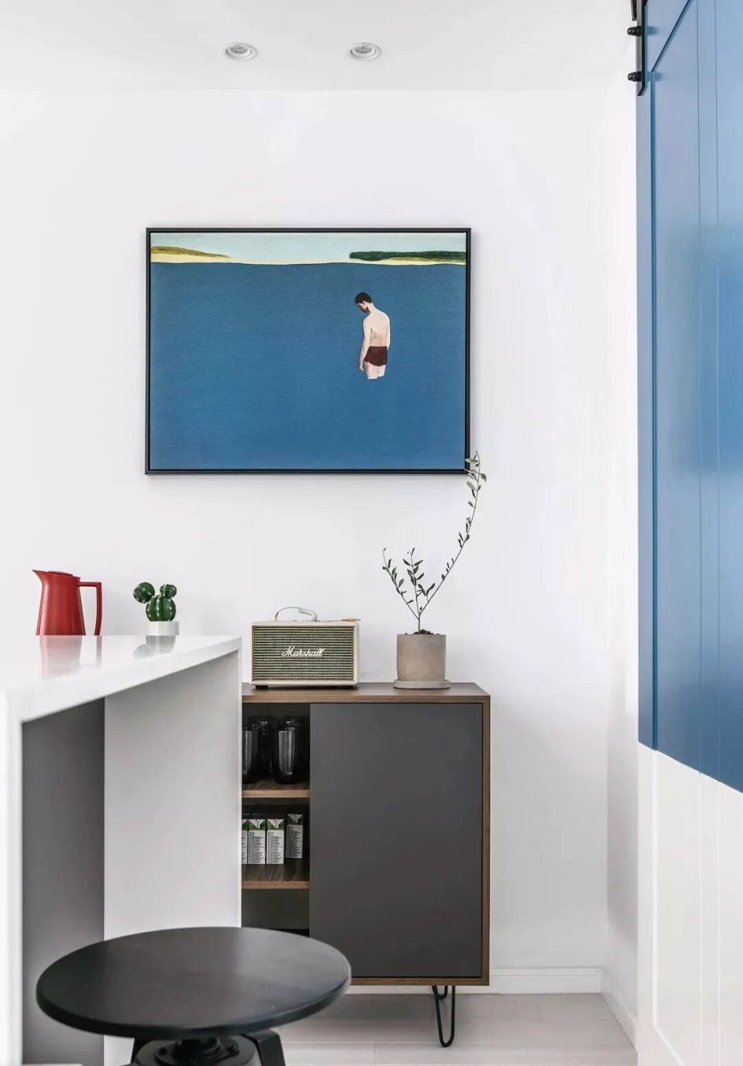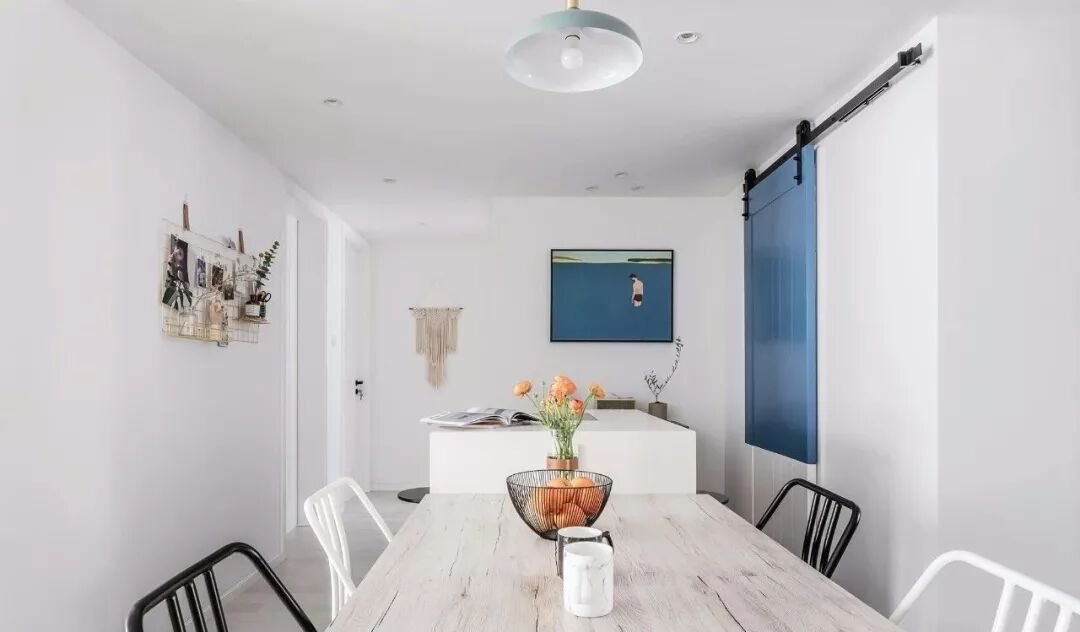 ▲ 蓝色穿插在餐厅空间中,挑选的装饰画也巧妙的运用蓝色,画作提升了整体艺术感,打破空白空间的同时,彰显格调